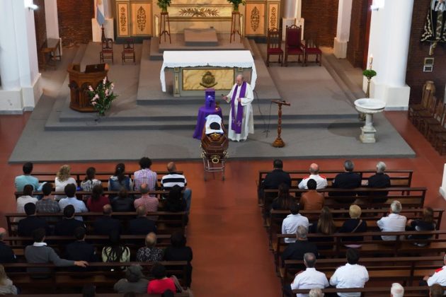En la Iglesia, el padre Mario Peralta esperaba el cortejo que acompañaba los restos de Ferrari. Una vez en la capilla, el sacerdote habló del Jefe de Bomberos Voluntarios, de su entrega a la comunidad desde muy joven. Al término de las oraciones, el cortejo partió por calle 24 con vehículos de la cochería que trasladaban a los familiares, detrás varios móviles del cuartel de Bomberos de Mercedes y de diferentes localidades que se hicieron presentes para despedir a Roberto Ferrari, compañero, amigo e instructor de otros bomberos.