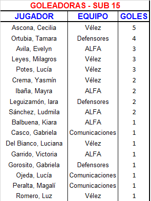VÉLEZ: -6-; Cecilia Ascona, Yasmín Crema (2), Milagros Leyes, Lucía Potes (2)