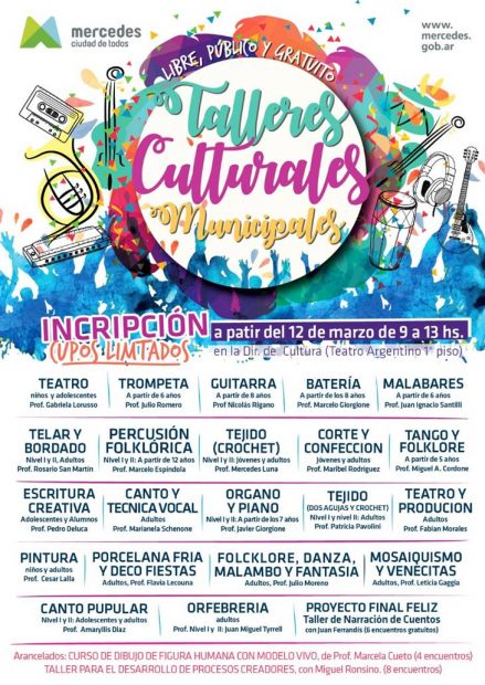 La inscripción estará abierta desde el lunes 12 de marzo y permanecerá por el período de dos semanas en las oficinas de la Dirección de Cultura de la Municipalidad de Mercedes, en el primer piso del ex Teatro Argentino.