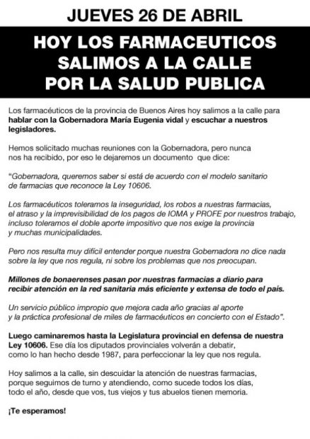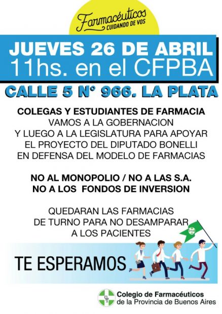 El Colegio de Farmacéuticos de la provincia de Buenos Aires convocó a sus matriculados a realizar este jueves 26 de abril una manifestación en la capital provincial contra la reforma de la ley que regula a las farmacias y su funcionamiento en el territorio bonaerense.