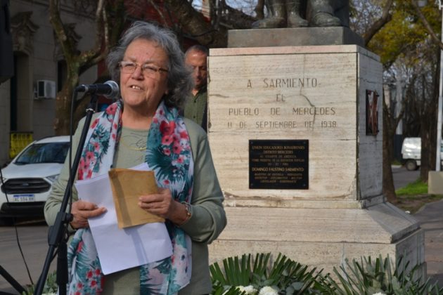 “No creo que debamos quedarnos solo en elogios por lo que Sarmiento hizo, sino que, parafraseando al poeta Navarro Puentes, me permito decir: Mercedes hace un alto en la jornada. Hagamos nuestro examen de conciencia. ¿Seguimos sus ejemplos de carácter, de actividad y de civismo? Y las lecciones sabias del gran muerto en su tumba que debiera ser cátedra, duermen con sus cenizas sus ideas. Pero si a 130 años de su muerte, Sarmiento contemplara, vería que su labor no fue del todo vana. Ni inútiles sus grandes sufrimientos. Que la Patria está sembrada de alfabetos con más libros que armas y más escuelas, muchas más que cárceles”, resaltó para luego concluir: “Escuchemos la voz de la conciencia, que no yerra ni engaña. No hagamos de un homenaje sólo la enumeración de logros, sino el cotidiano ejercicio de lo que él nos legara. T entonces el Maestro viendo en nosotros su obra realizada. Se sentirá más grande y más firme en su estatua”.