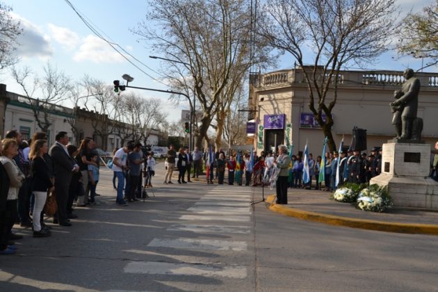 Breve acto protocolar se realizó en donde se encuentra el busto de Sarmiento. Abanderados de la Escuela Normal (ISFD N° 137), de la Secundaria N° 13, del Instituto Santa María, de Bomberos Voluntarios, del Servicio Penitenciario y de la Alianza Francesa se hicieron presentes.