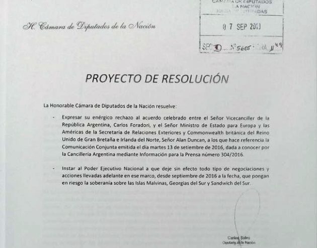 “La cuestión Malvinas es una causa nacional y ha sido asumida como causa global por la mayoría de los países del mundo cuando las Naciones Unidas reconoció la existencia de una situación colonial y de una disputa de soberanía entre Argentina y Reino Unido. El mejor homenaje a nuestros Ex-Combatientes y a nuestros soldados caídos, es seguir luchando con las herramientas de la democracia por la recuperación plena de nuestra soberanía usurpada”, dijo y por eso presentó un proyecto rechazando el acuerdo y solicitando al Poder Ejecutivo que “deje sin efecto todo tipo de negociaciones y acciones llevadas adelante en ese marco”.