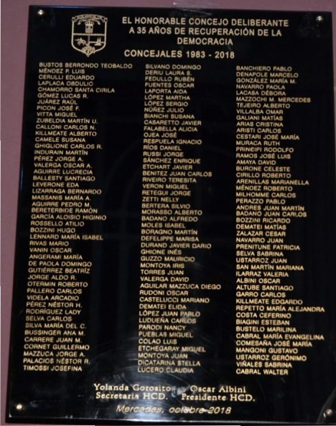 El cierre del acto se dio con el descubrimiento de dos placas que inmortalizaron la fecha. Una de éstas, incluye el listado completo de los concejales que ocuparon bancas en el Honorable Concejo Deliberante de Mercedes.