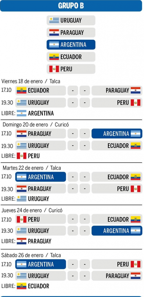 En el Sudamericano Argentina integrará el Grupo B junto a Uruguay, Paraguay, Ecuador y Perú. El debut del elenco «Albiceleste» será el domingo 20 de enero, a las 17.10, ante el conjunto paraguayo en la sede de Curicó.