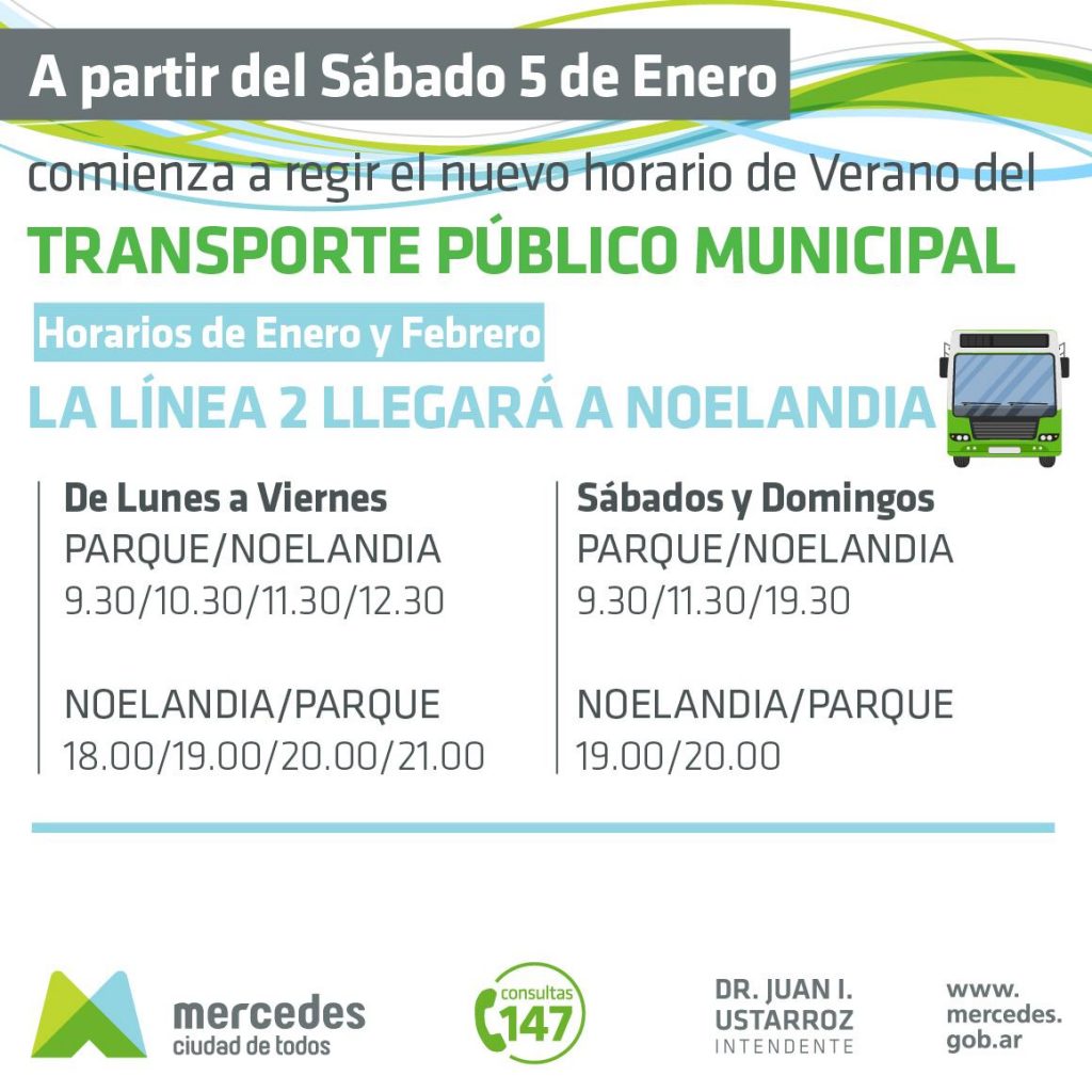 El Municipio de Mercedes informó la ampliación del recorrido de la Línea 2 del Servicio de Transporte Urbano de Pasajeros. A partir del 5 de enero, el recorrido que se inicia en el Parque Municipal y llega al Barrio Favaloro, ampliará su viaje durante los meses de enero y febrero hasta Noelandia y modifica sus horarios.