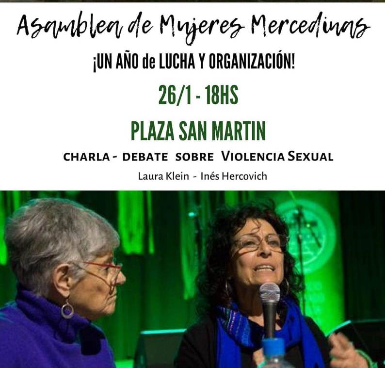 «Por esta razón es que decidimos hacer una charla debate sobre esta problemática al cumplirse un año de nuestra conformación como asamblea, con dos especialistas de lujo: Laura Klein, Lic. de Filosofía (UBA), poeta y ensayista, junto a Inés Hercovich, Socióloga y Psicóloga Social y desde hace décadas se ocupa de investigar temas relacionados con las diferentes formas de discriminación de la mujer. Es pionera en el estudio de la violencia sexual contra las mujeres, uno de sus libros es Enigma sexual de la violación», extienden la invitación para la semana del 26 de enero.