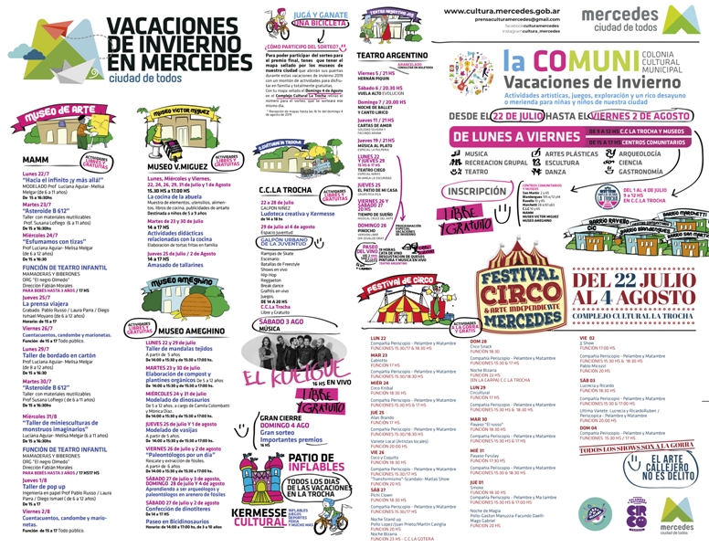 Este viernes comenzó la inscripción para la Colonia Cultural que lleva adelante la Municipalidad de Mercedes en los espacios culturales comunales. La colonia cultura está enmarcada en las dos semanas de actividades con propuestas diversas para las vacaciones de invierno. El MAMM y el Museo Ameghino abrió inscripción para diferentes opciones que se brindarán en cada uno de los espacios. Entre el 22 de julio y el 4 de agosto, habrá circo a la gorra, artes, inflables, entre otras propuestas en distintos espacios de la ciudad.
