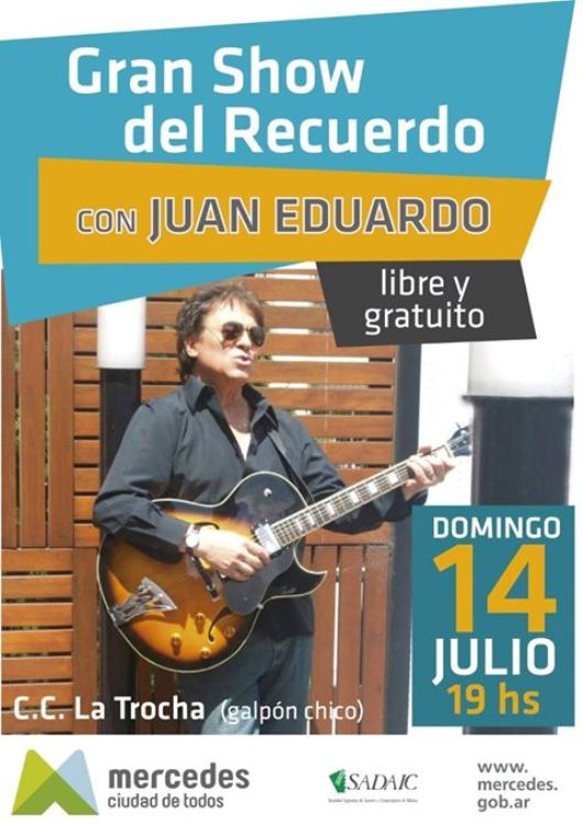 A partir de la hora 19 del día domingo 14 de julio, se realizará un show del recuerdo con la actuación estelar de Juan Eduardo, ex integrante de Juan y Juan. El músico y cantante hará un recorrido musical de la década de los años 70. El show será en el salón chico calefaccionado del Complejo Cultural La Trocha con entrada libre y gratuita.