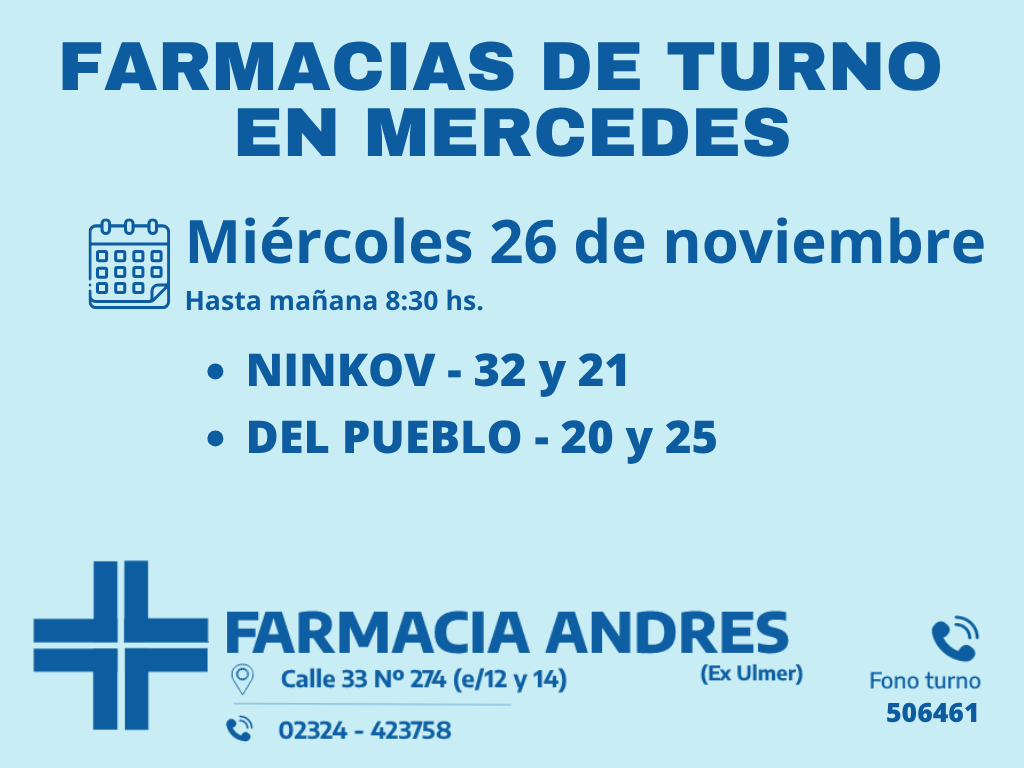 Desde las 8 30 del día de hoy hasta la misma hora de mañana las farmacias de turno en Mercedes son Ninkov y Del Pueblo