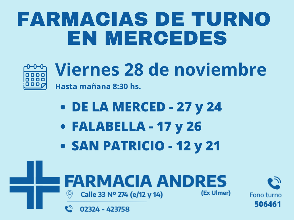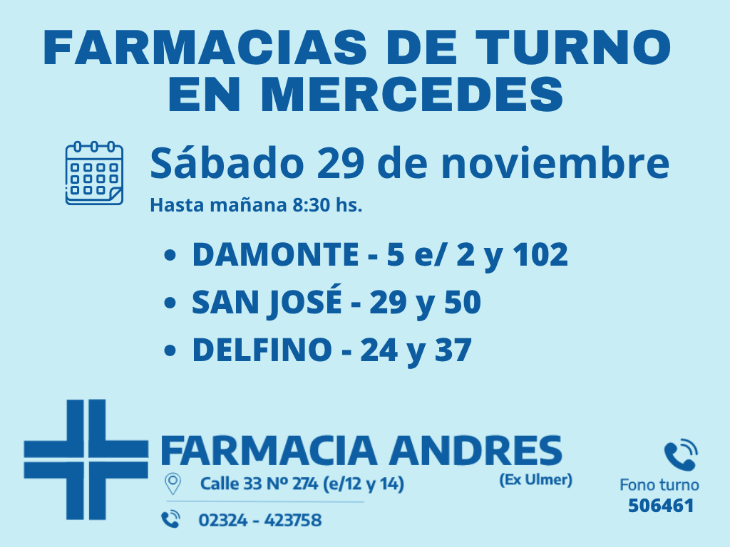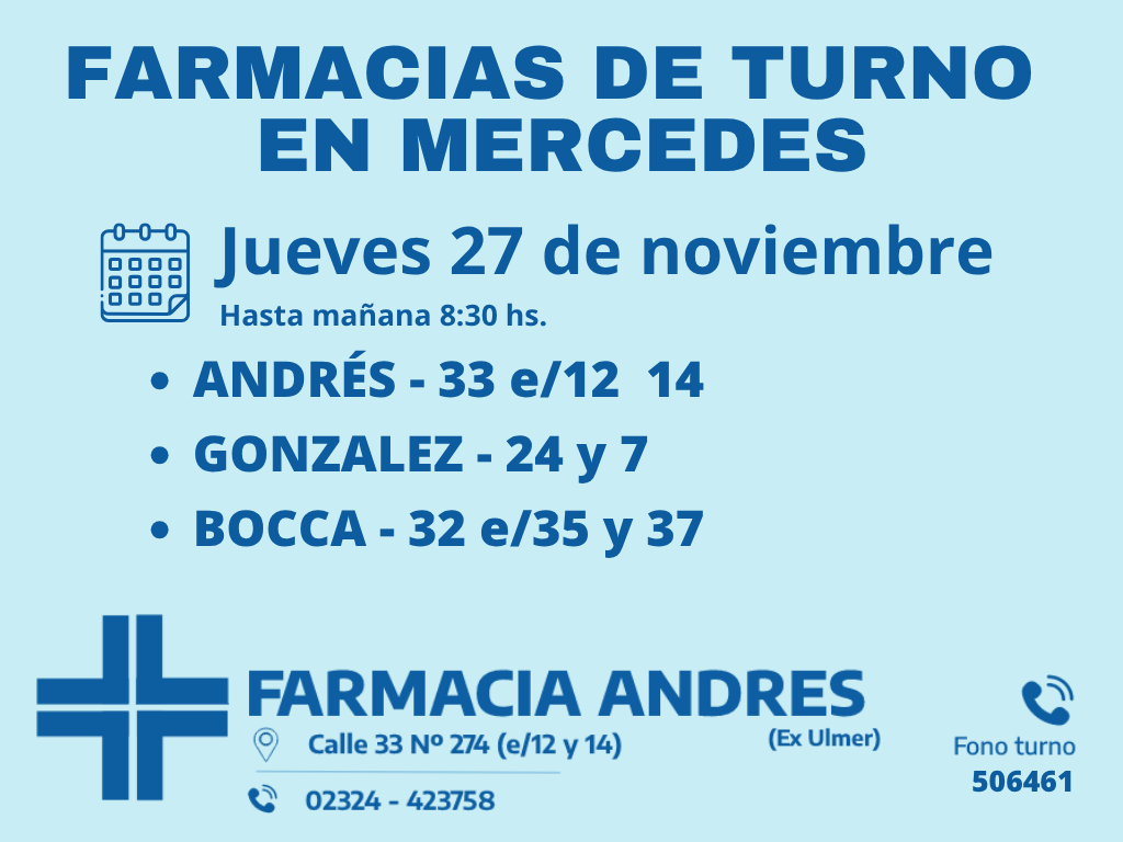 Desde las 8 30 del día de hoy hasta la misma hora de mañana las farmacias de turno en Mercedes son Andrés, González y Bocca