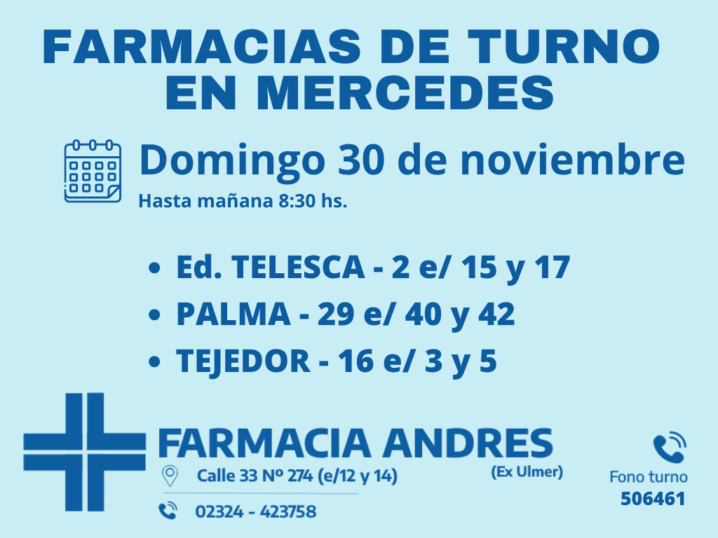 Desde las 830 del día de hoy hasta la misma hora de mañana, las farmacias de turno en Mercedes son: Eduardo Telesca, Palma y Tejedor.