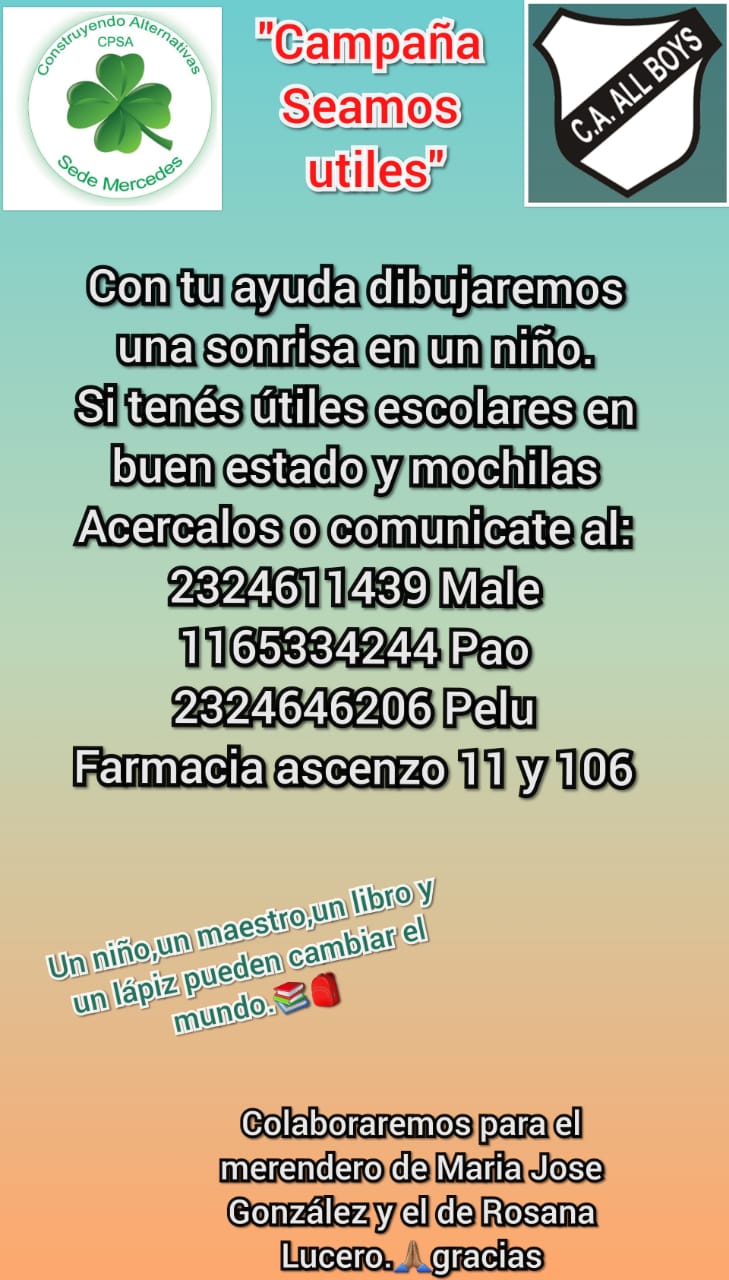Una nueva campaña solidaria se inició desde All Boys Solidario y Escuela Construyendo Alternativa Sede Mercedes. En esta oportunidad, le solicitan a la comunidad que … Leer.