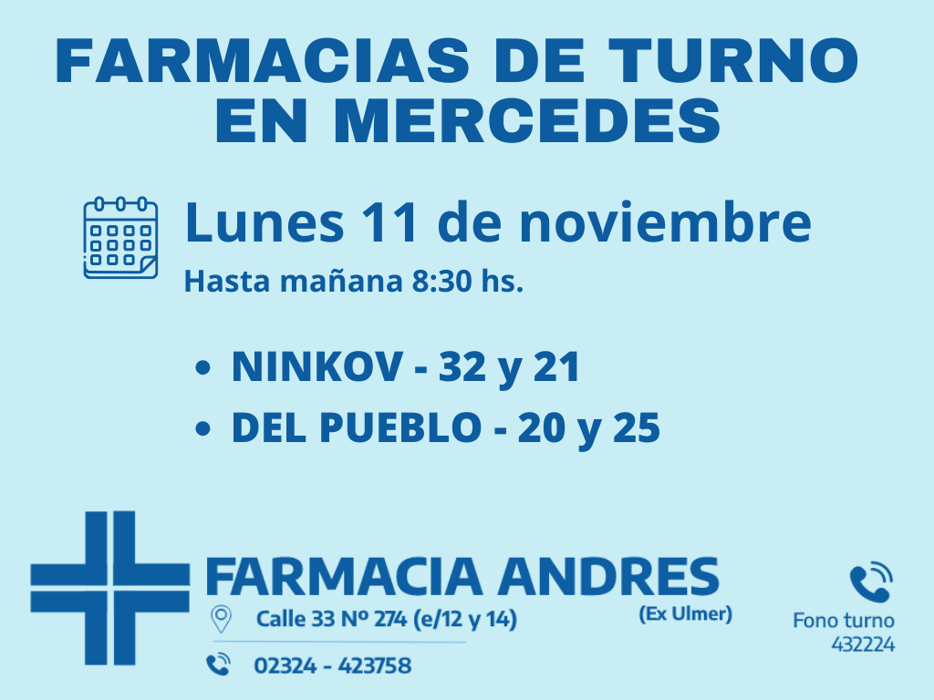 Desde las 8:30 del día de hoy hasta la misma hora de mañana, las farmacias de turno en Mercedes son: Mangoni, Silvestre y Ninkov