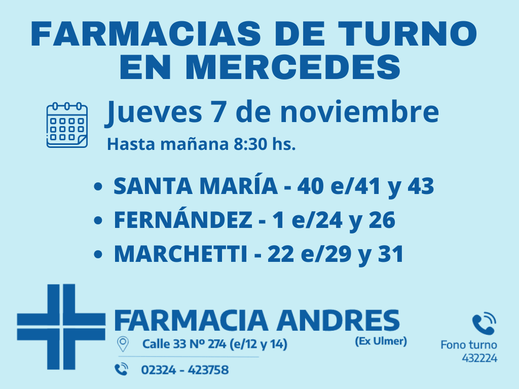 Desde las 8:30 del día de hoy hasta la misma hora de mañana, las farmacias de turno en Mercedes son: Andrés, González y Bocca.