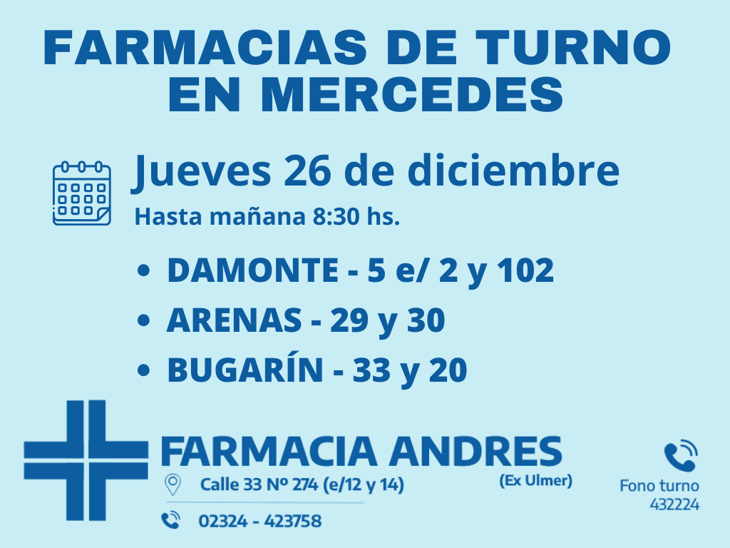 Desde las 8 30 del día de hoy hasta la misma hora de mañana las farmacias de turno en Mercedes son Damonte, Bugarin y Andrés