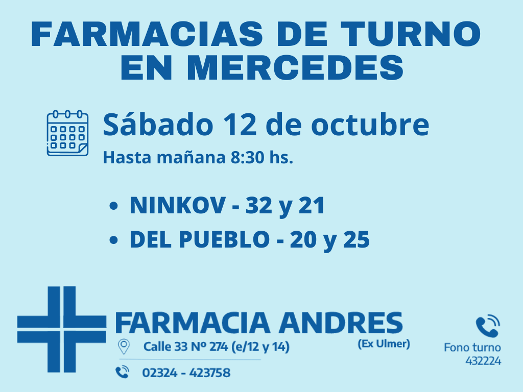 Desde las 8 30 del día de hoy hasta la misma hora de mañana las farmacias de turno en Mercedes son Ninkov y Del Pueblo
