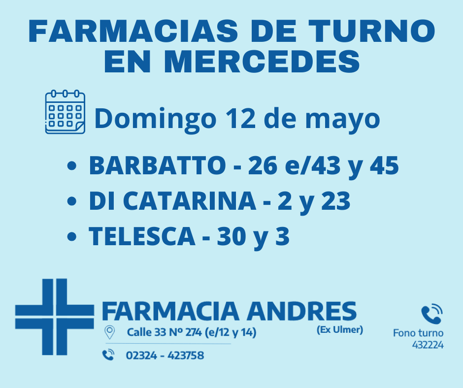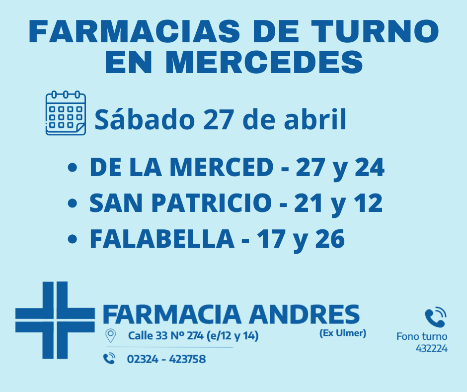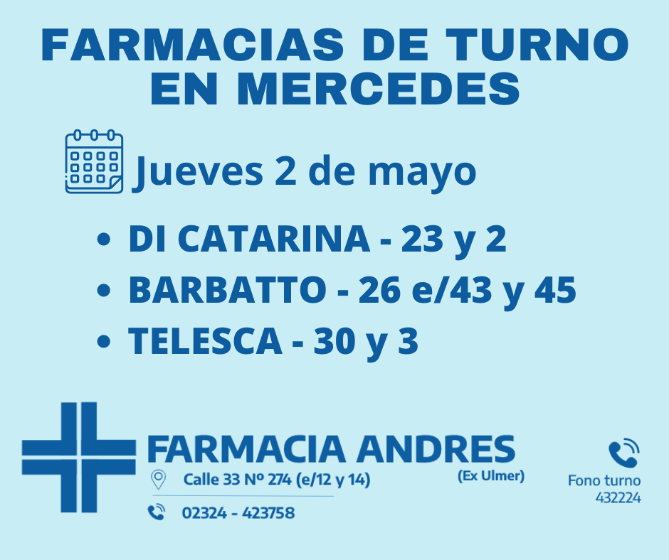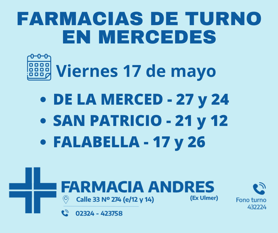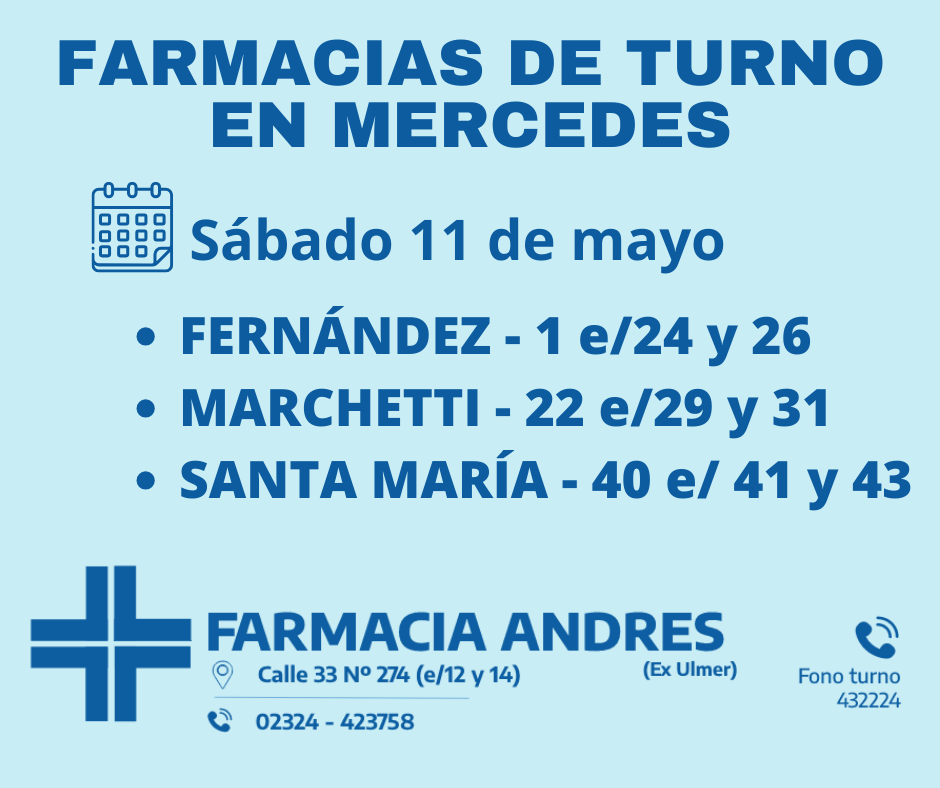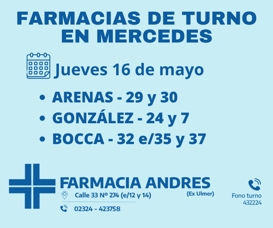 Desde las 8:30 del día de hoy hasta la misma hora de mañana, las farmacias de turno en Mercedes son: Andrés, González y Bocca.