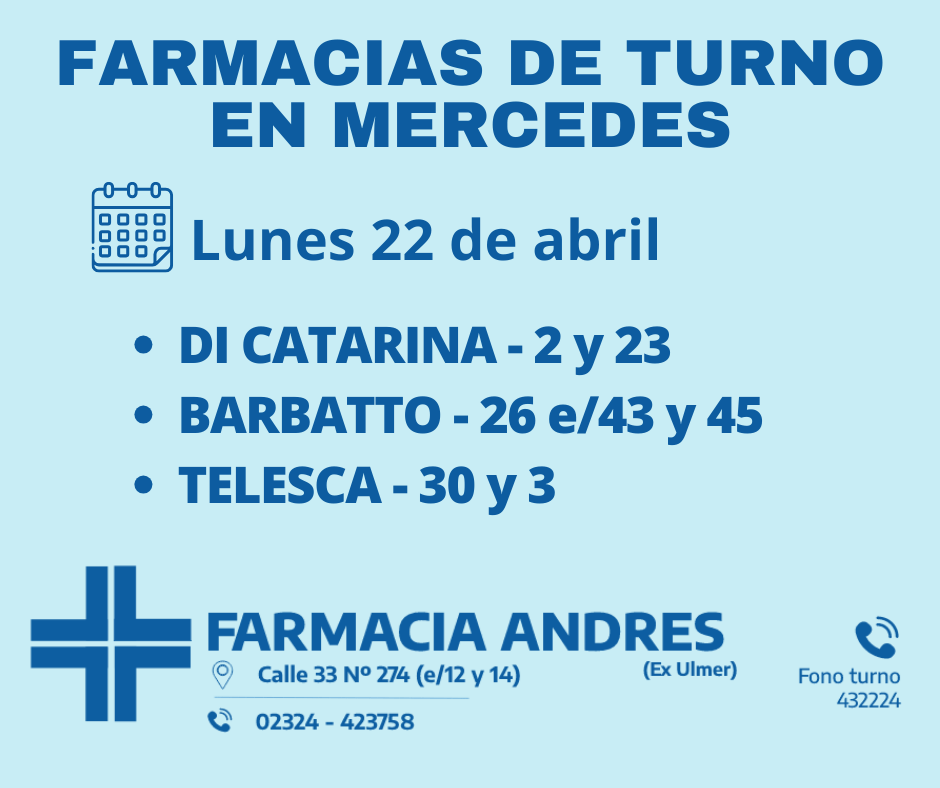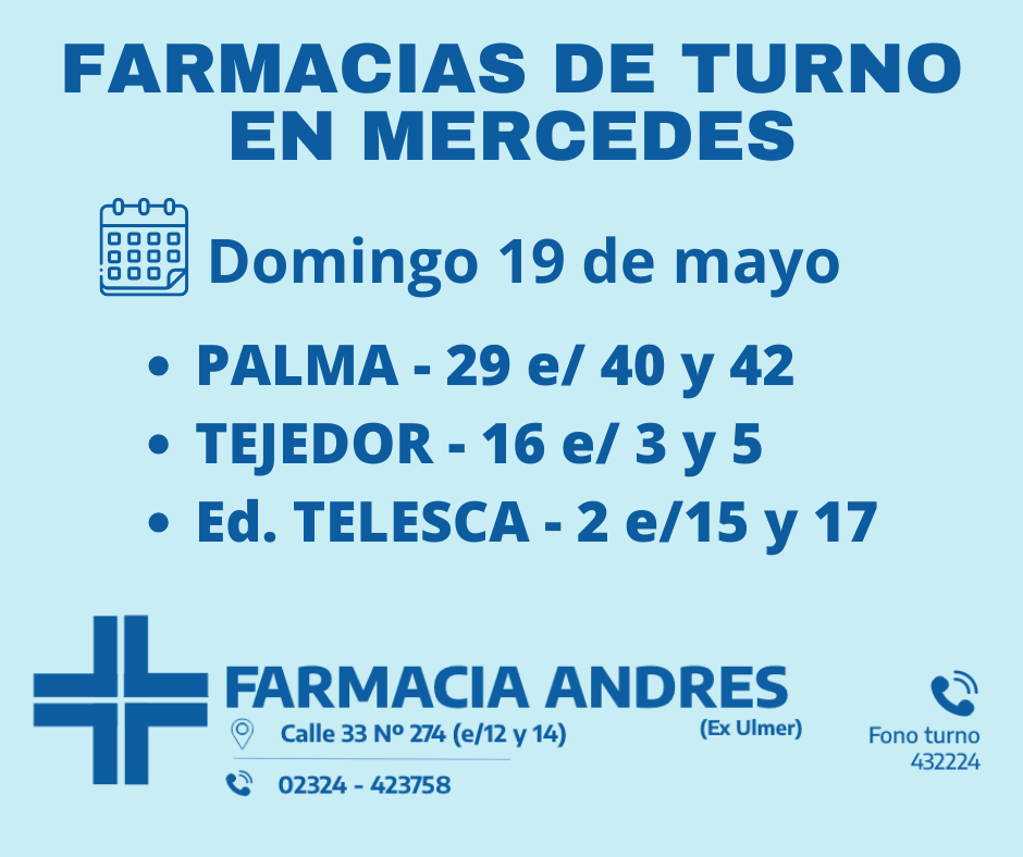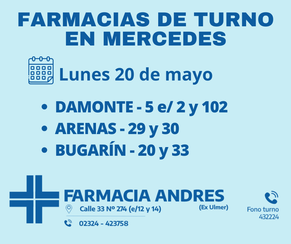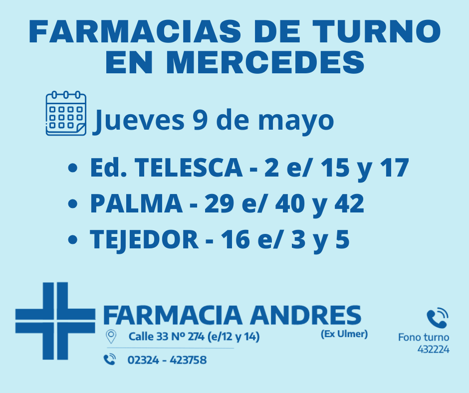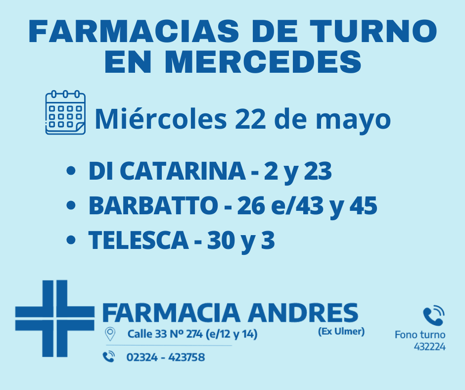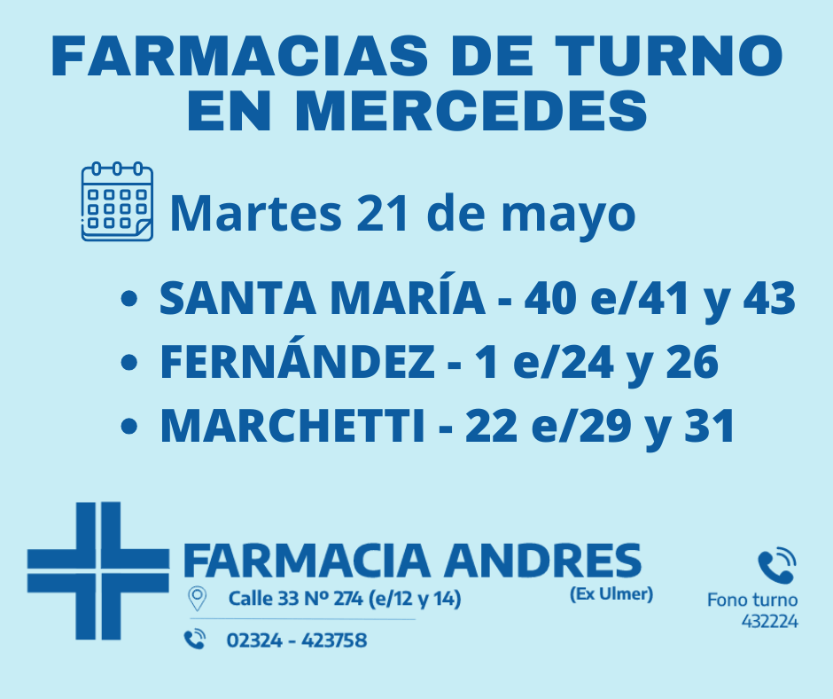 Desde las 8:30 del día de hoy hasta la misma hora de mañana, las farmacias de turno en Mercedes son: Andrés, González y Bocca.