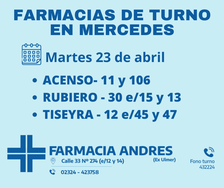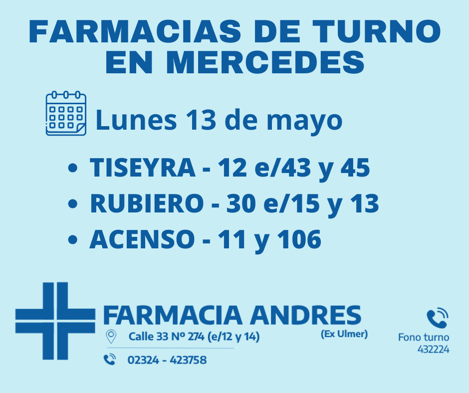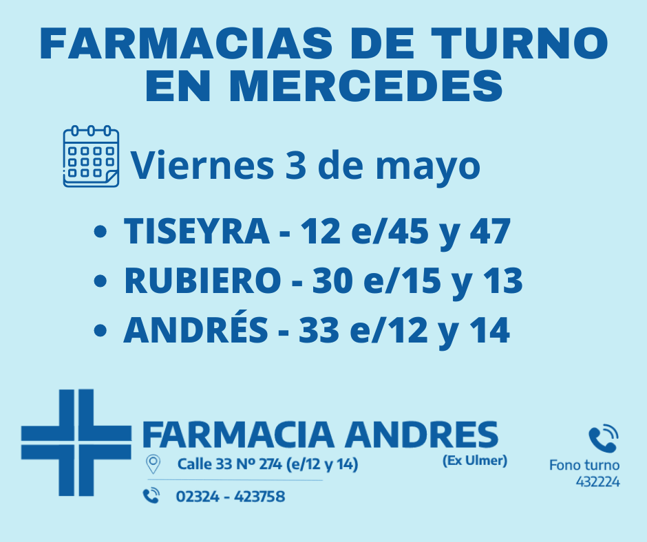 Desde las 8:30 del día de hoy hasta la misma hora de mañana, las farmacias de turno en Mercedes son: Tiseyra, Rubiero y Andrés.