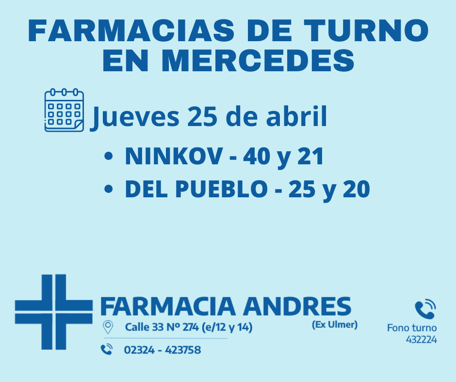 Desde las 8 30 del día de hoy hasta la misma hora de mañana las farmacias de turno en Mercedes son Ninkov y Del Pueblo