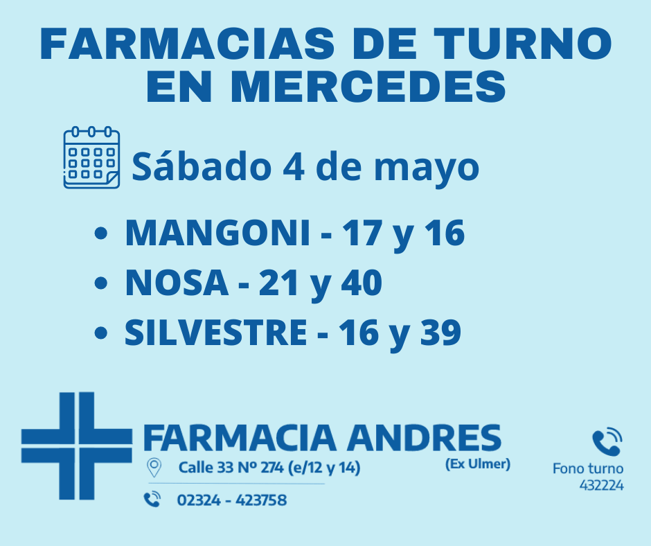 Desde las 8 30 del día de hoy hasta la misma hora de mañana las farmacias de turno en Mercedes son Nosa, Silvestre y Mangoni