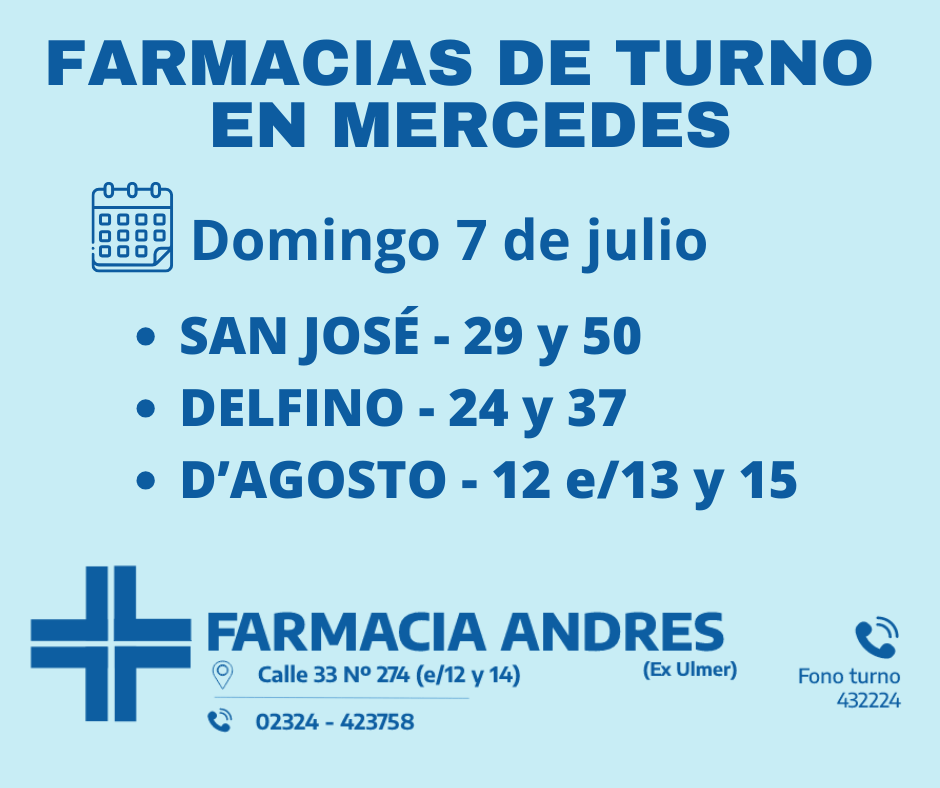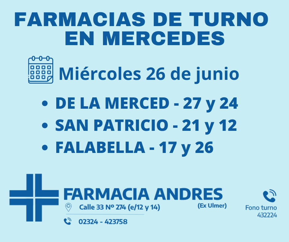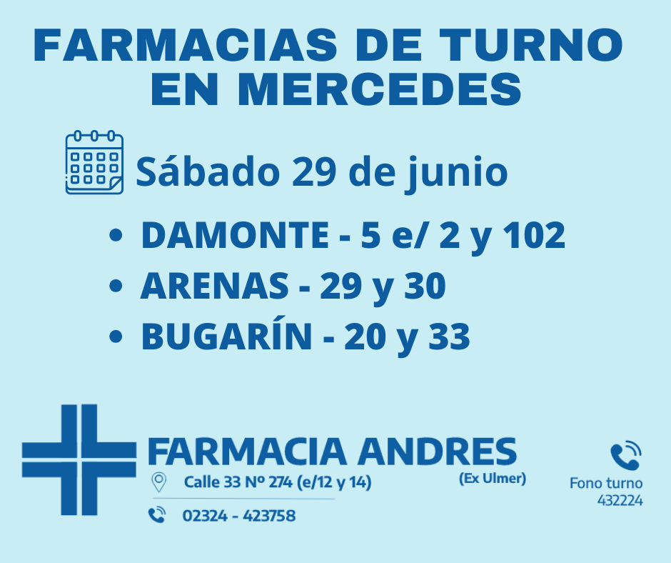 Desde las 8:30 del día de hoy hasta la misma hora de mañana las farmacias de turno en Mercedes son Andrés, Gonzalez y Bocca.