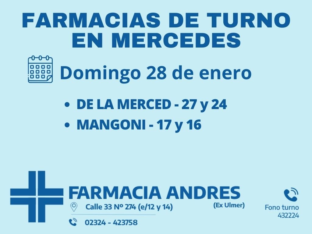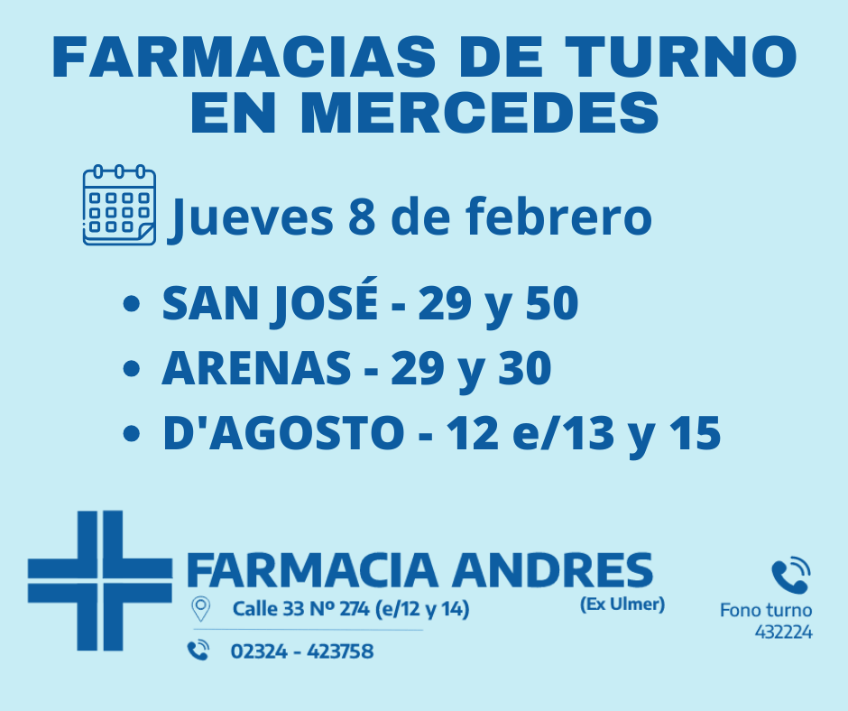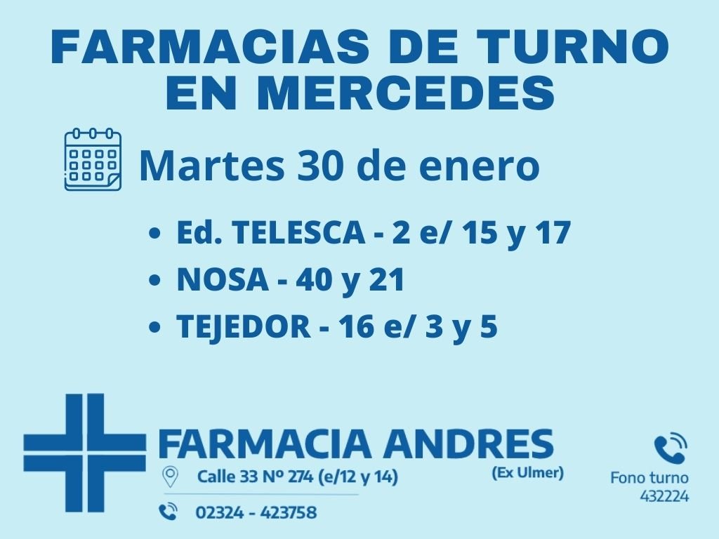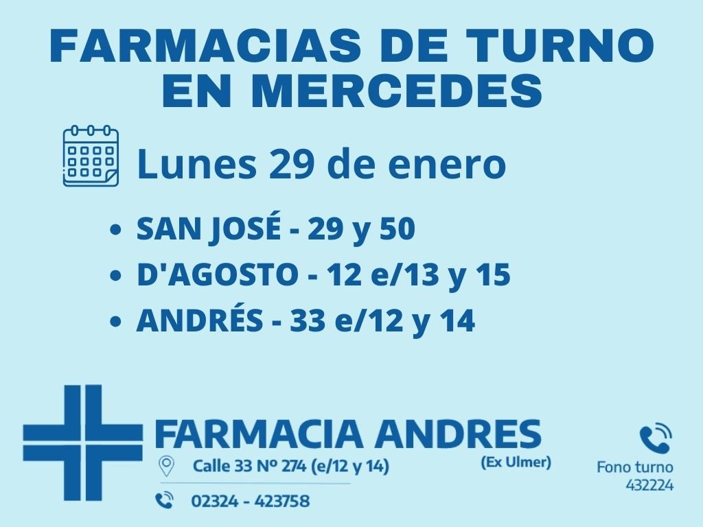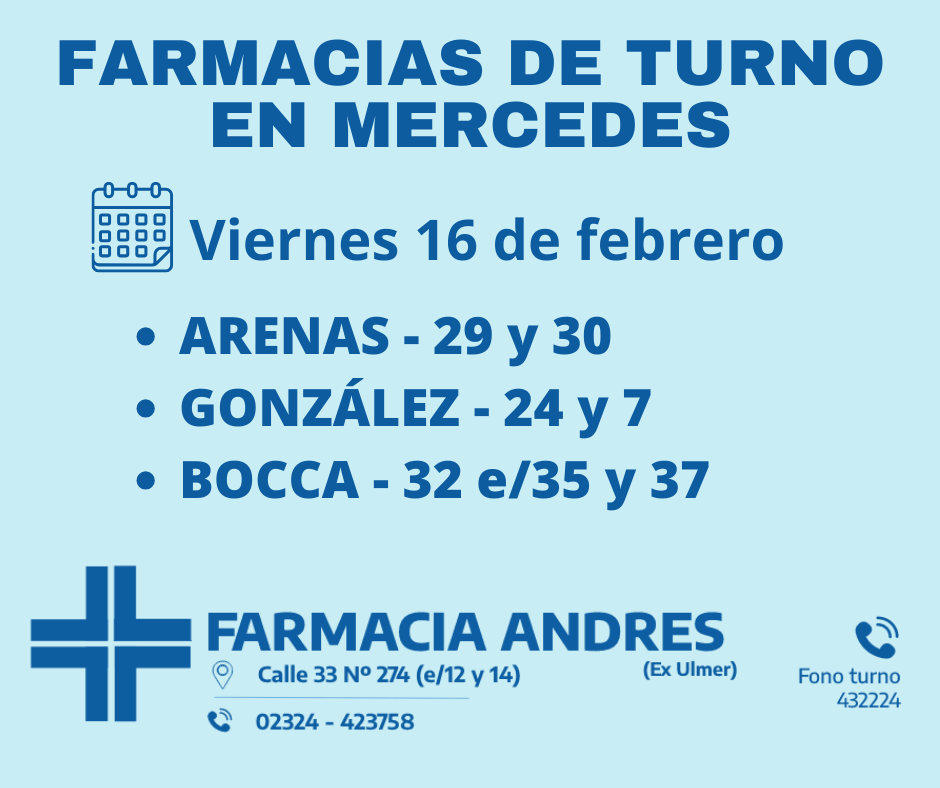 Desde las 8:30 del día de hoy hasta la misma hora de mañana las farmacias de turno en Mercedes son Andrés y Bocca