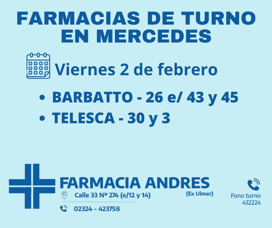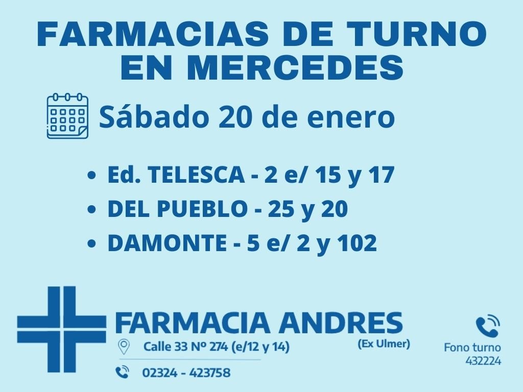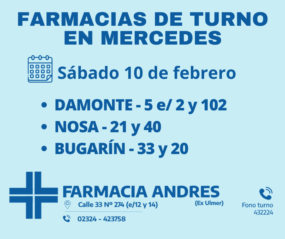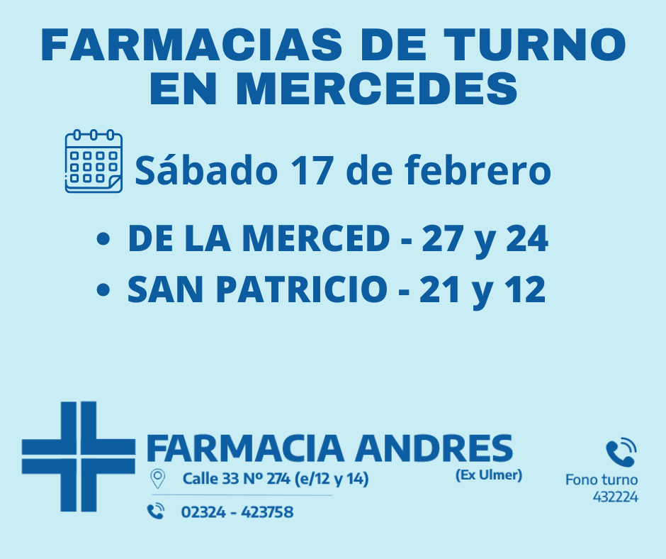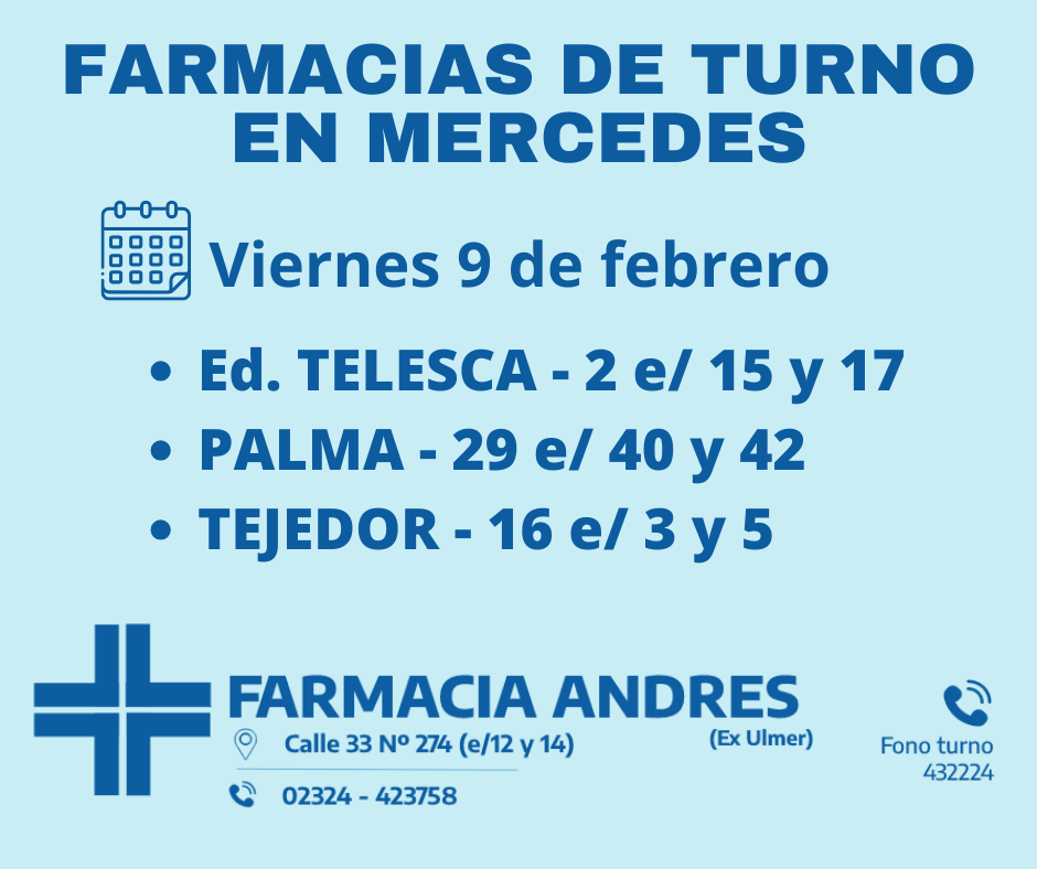 Desde las 8:30 del día de hoy hasta la misma hora de mañana las farmacias de turno en Mercedes son Andrés y Bocca