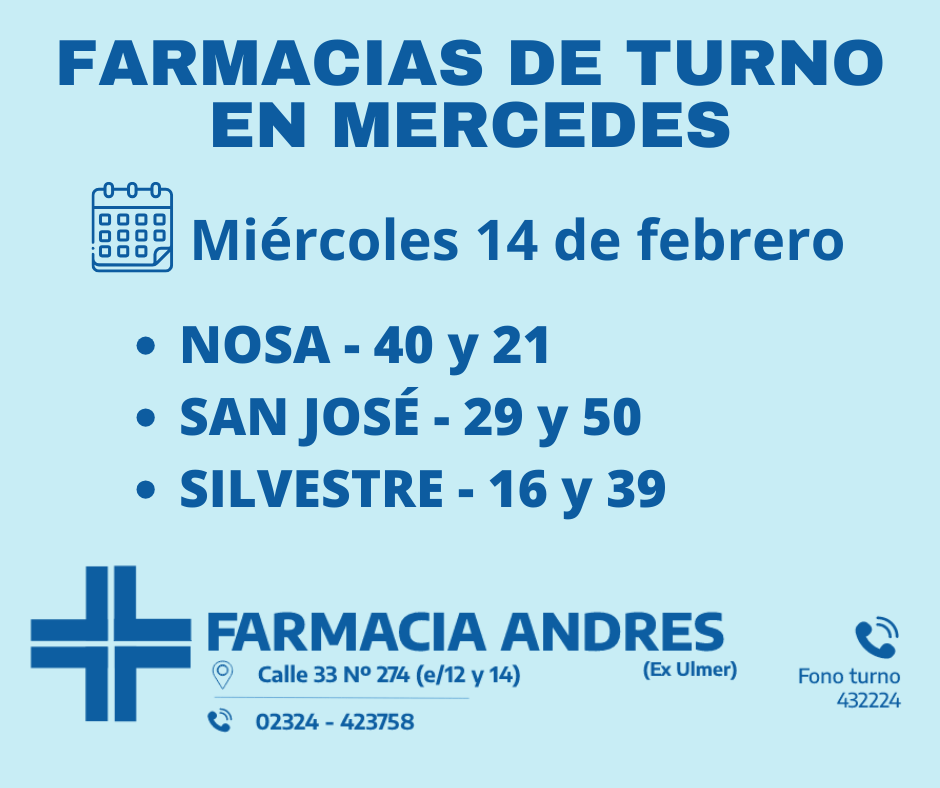 Desde las 8 30 del día de hoy hasta la misma hora de mañana las farmacias de turno en Mercedes son Silvestre, Nosa y Mangoni.