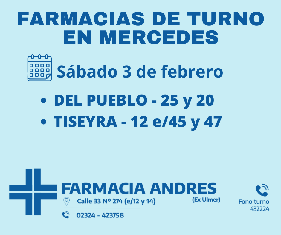 Desde las 8:30 del día de hoy hasta la misma hora de mañana, las farmacias de turno en Mercedes son: Del Pueblo y Tiseyra.