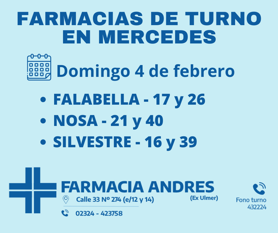 Desde las 8:30 del día de hoy hasta la misma hora de mañana las farmacias de turno en Mercedes son Falabella, Nosa y Silvestre.