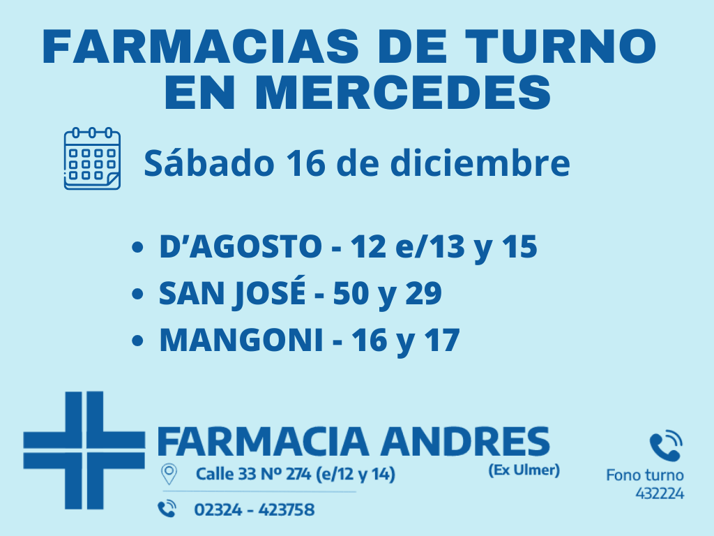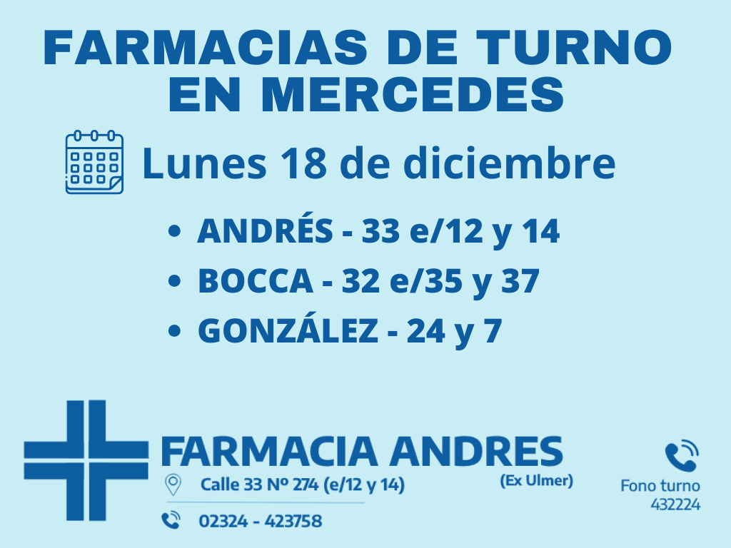 Desde las 8:30 del día de hoy hasta la misma hora de mañana las farmacias de turno en Mercedes son Andrés, Bocca y González.