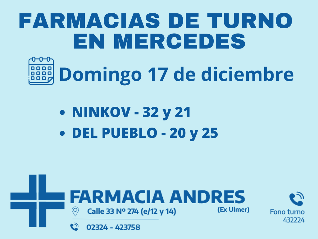 Desde las 8:30 del día de hoy hasta la misa hora de mañana, las farmacias de turno en Mercedes son: Ninkov y Del Pueblo