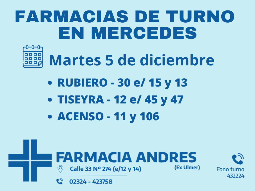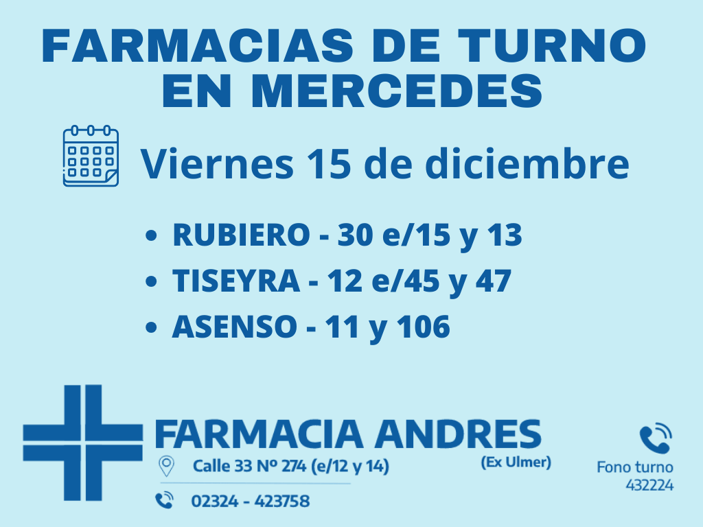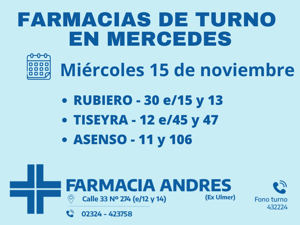 Desde las 8 30 del día de hoy hasta la misma hora de mañana las farmacias de turno en Mercedes son Rubiero, Tiseya y Acenso.