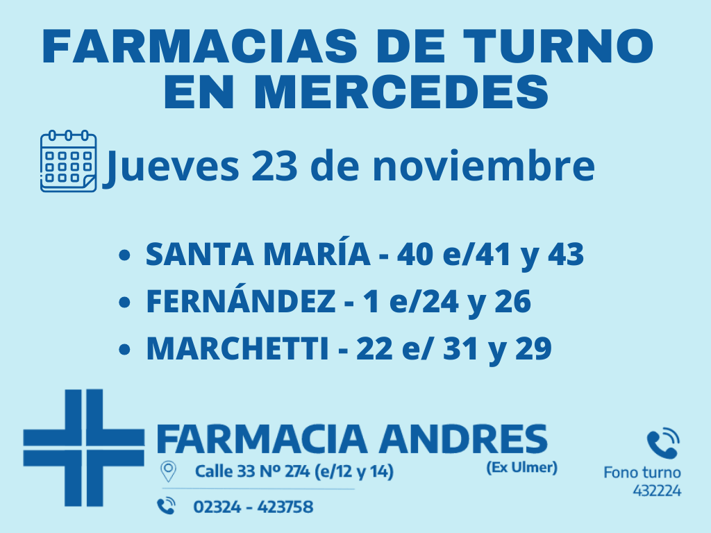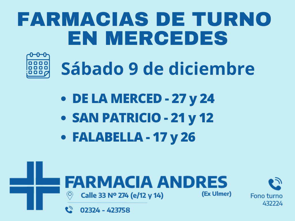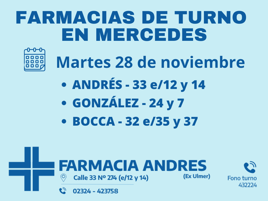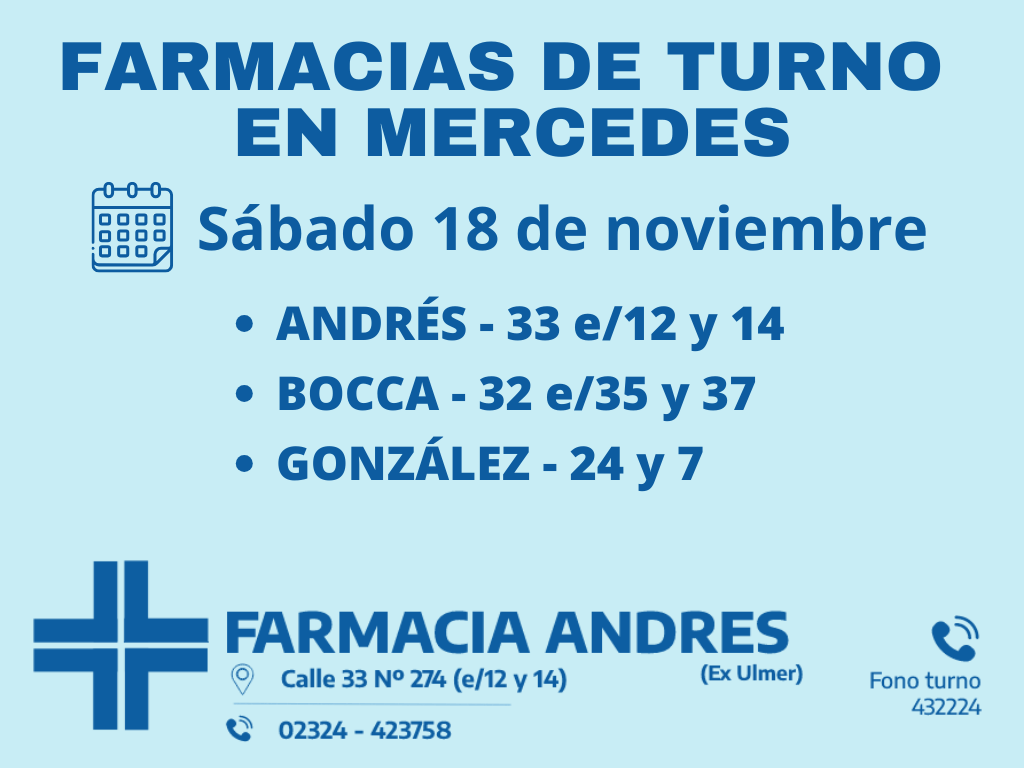 Desde las 8:30 del día de hoy hasta la misma hora de mañana, las farmacias de turno en Mercedes son: Andrés, González y Bocca.
