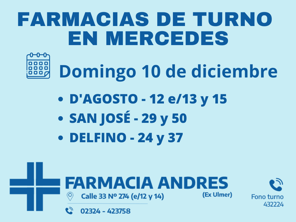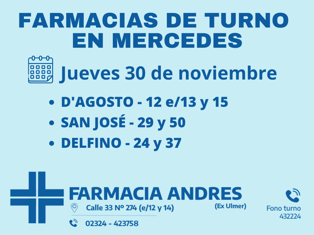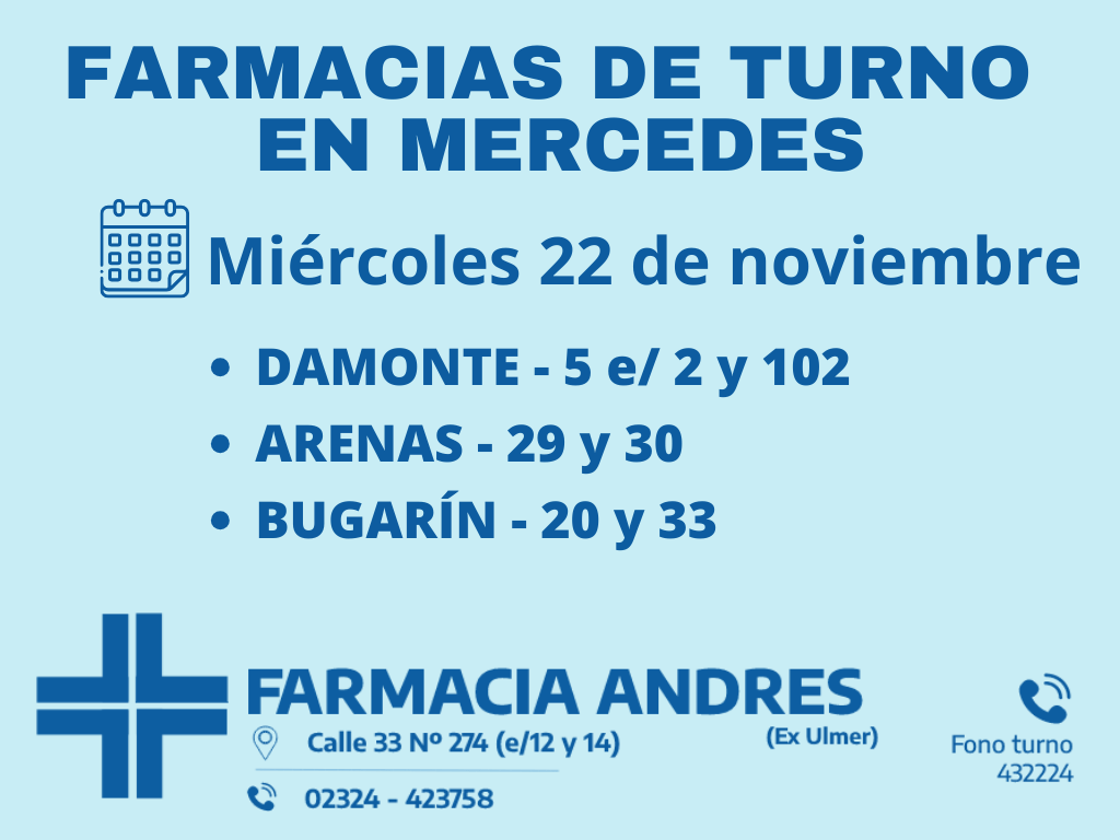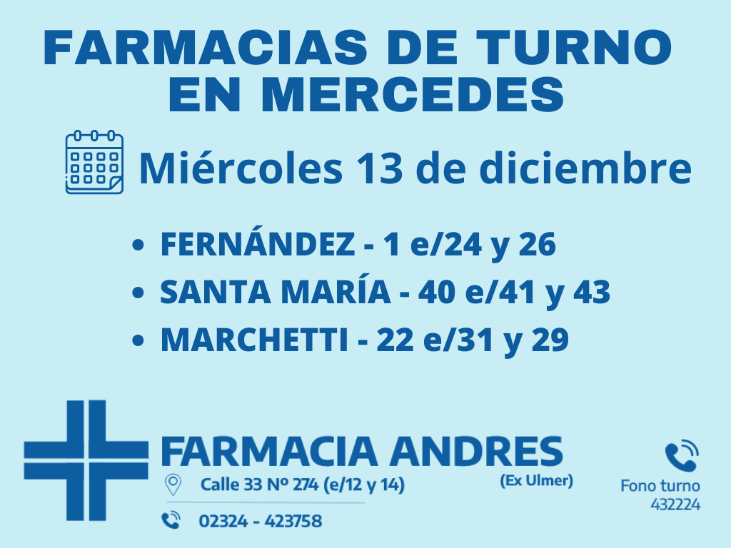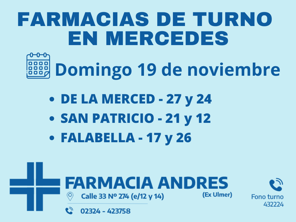 Desde las 8:30 del día de hoy hasta la misma hora de mañana, las farmacias de turno en Mercedes son: Andrés, González y Bocca.