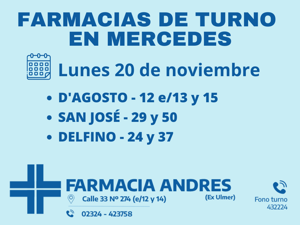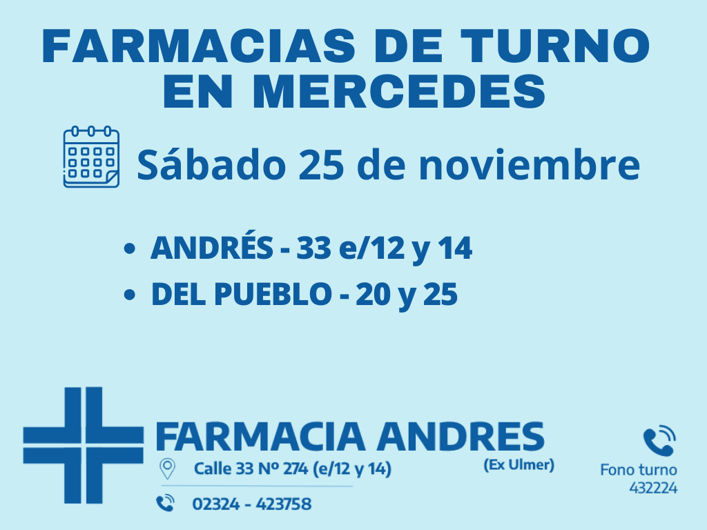 Desde las 8:30 del día de hoy hasta la misma hora de mañana, las farmacias de turno en Mercedes son: Andrés y Del Pueblo