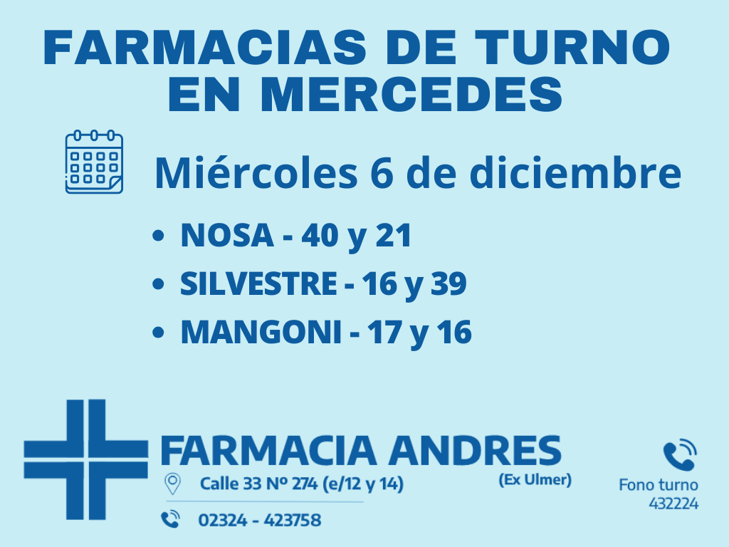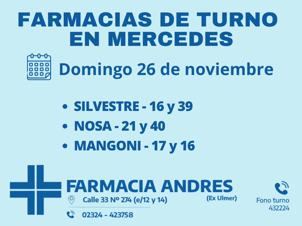 Desde las 8 30 del día de hoy hasta la misma hora de mañana las farmacias de turno en Mercedes son Silvestre, Nosa y Mangoni.