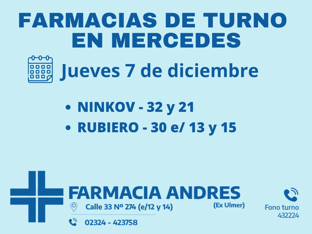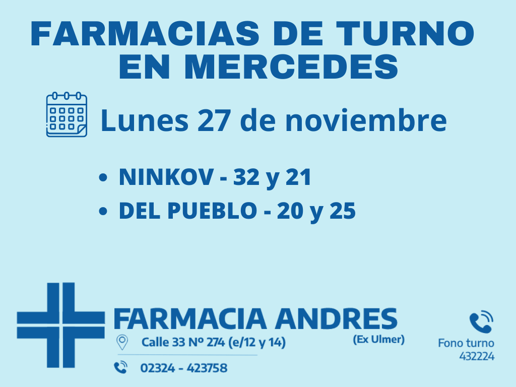 Desde las 8:30 del día de hoy hasta la misma hora de mañana, las farmacias de turno en Mercedes son Ninkov y Del Pueblo