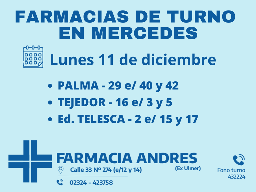Desde las 8:30 del día de hoy hasta la misma hora de mañana, las farmacias de turno en Mercedes son: Eduardo Telesca, Palma, y Tejedor.