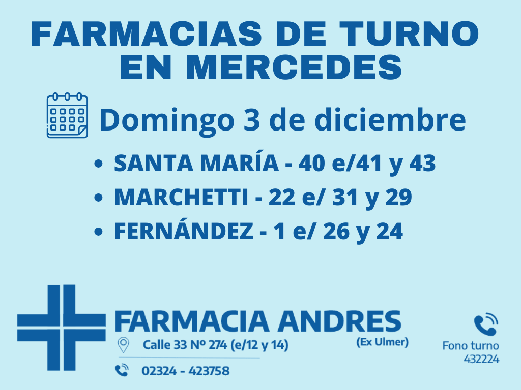 Desde las 8:30 del día de hoy hasta la misma hora de mañana, las farmacias de turno en Mercedes son: Santa María, Fernández y Marchetti.