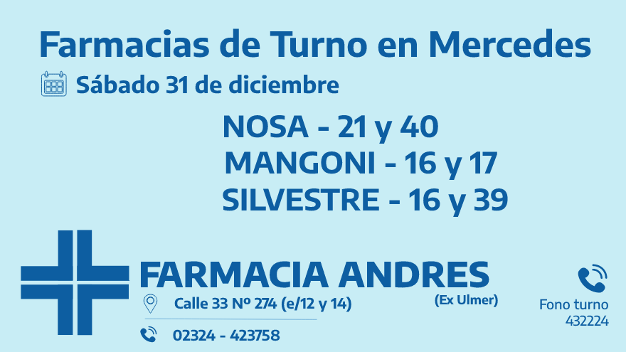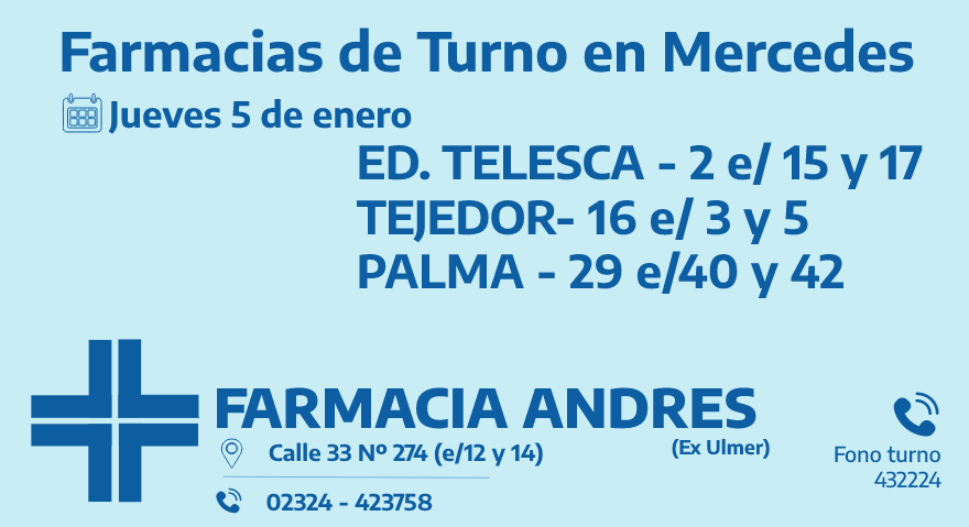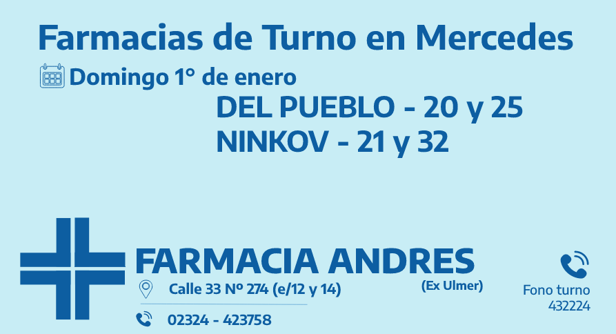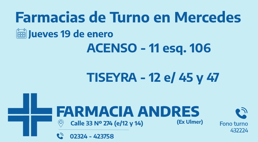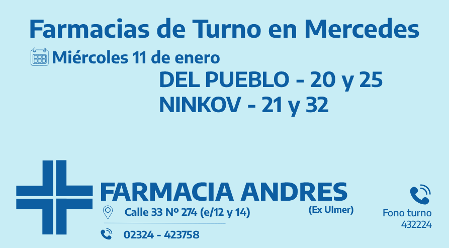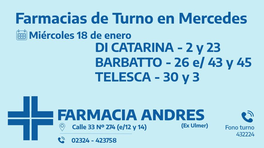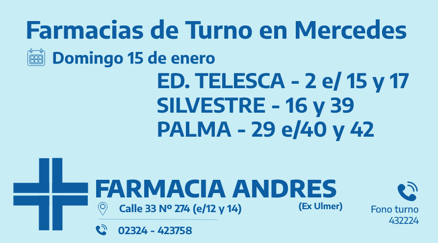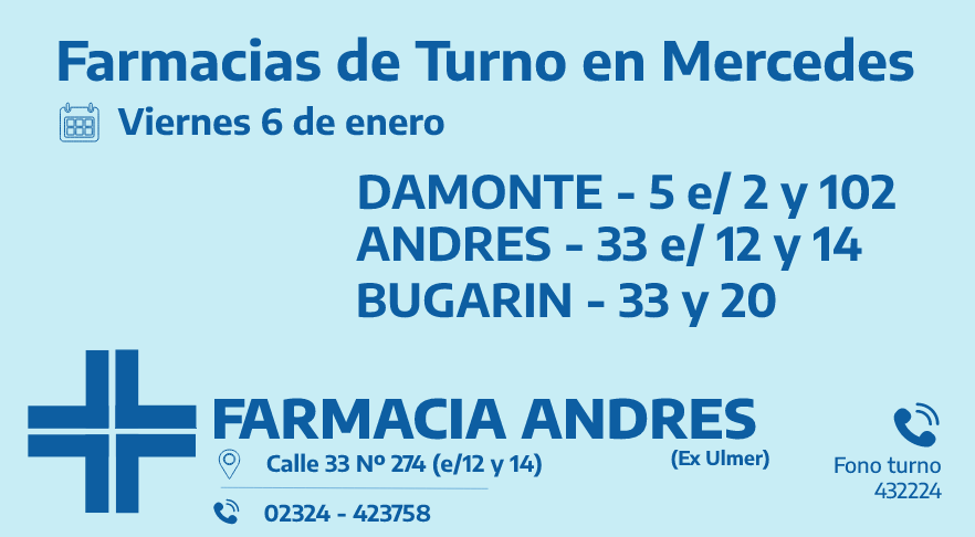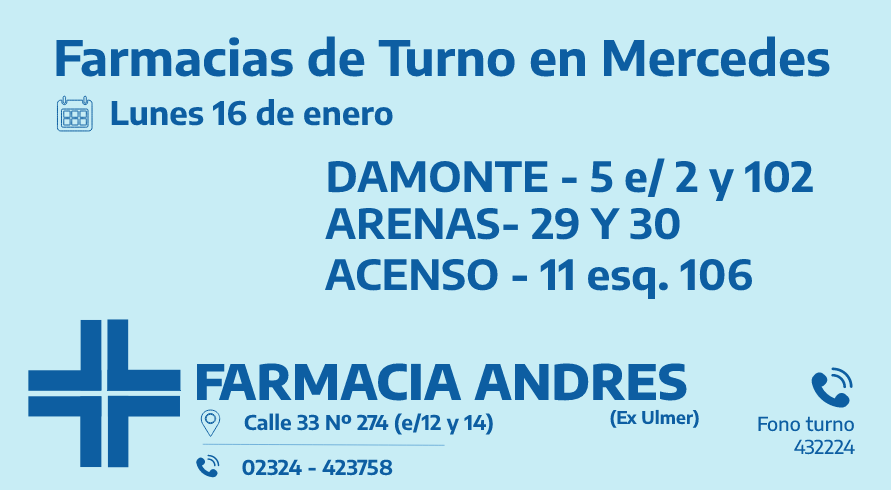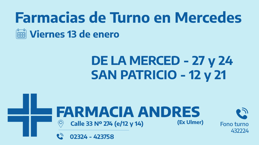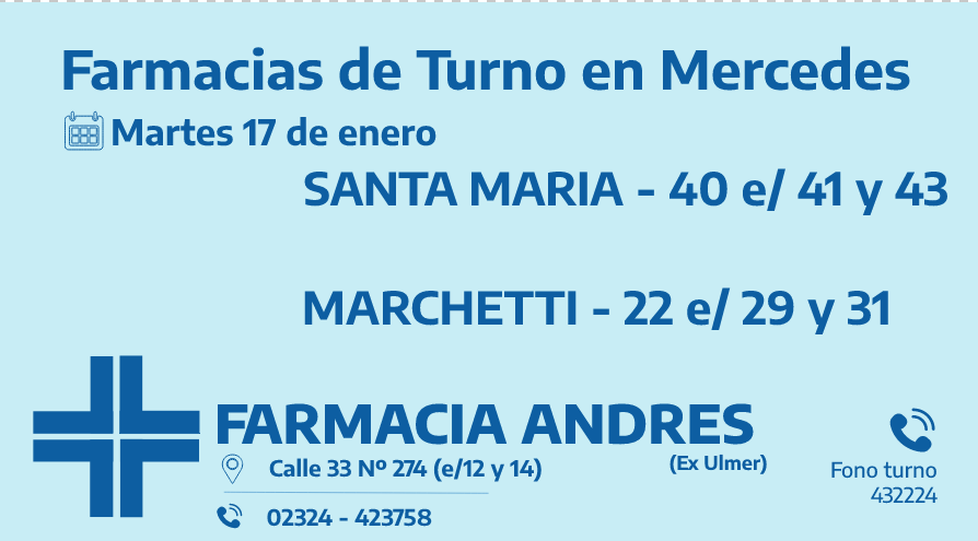 Desde las 8:30 del día de hoy hasta la misma hora de mañana, las farmacias de turno en Mercedes son Andrés, González y Bocca.