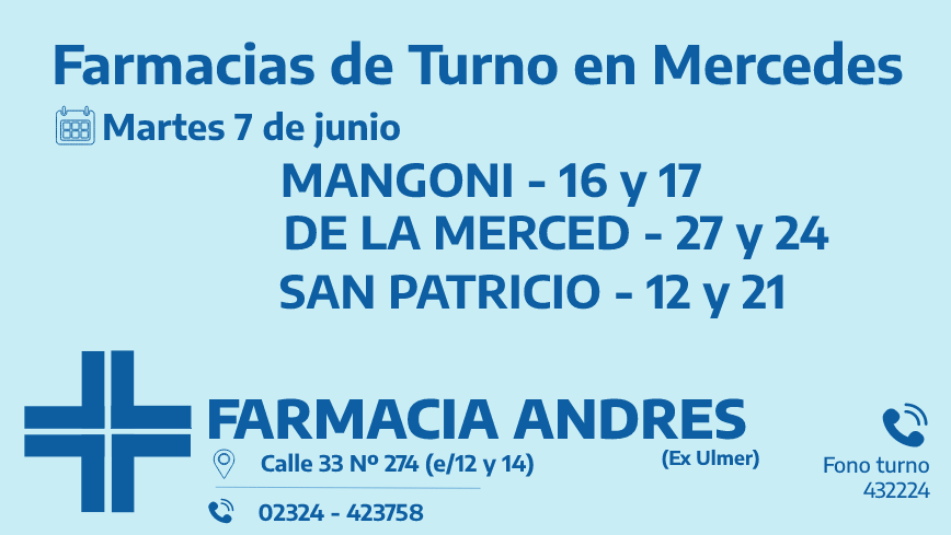 Desde las 8:30 del día de hoy hasta la misma hora de mañana, las farmacias de turno en Mercedes son: Eduardo Telesca, Andrés y Palma.