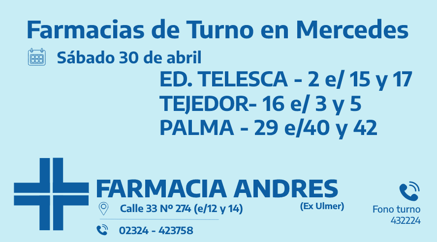 Desde las 8:30 del día de hoy, hasta la misma hora de mañana, las farmacias de turno en Mercedes son: Eduardo Telesca, Tejedor y Palma.