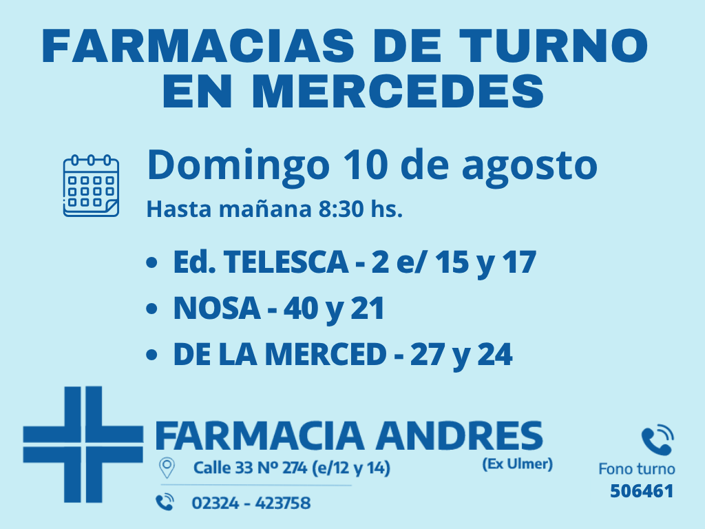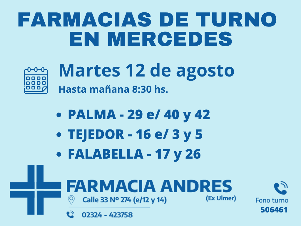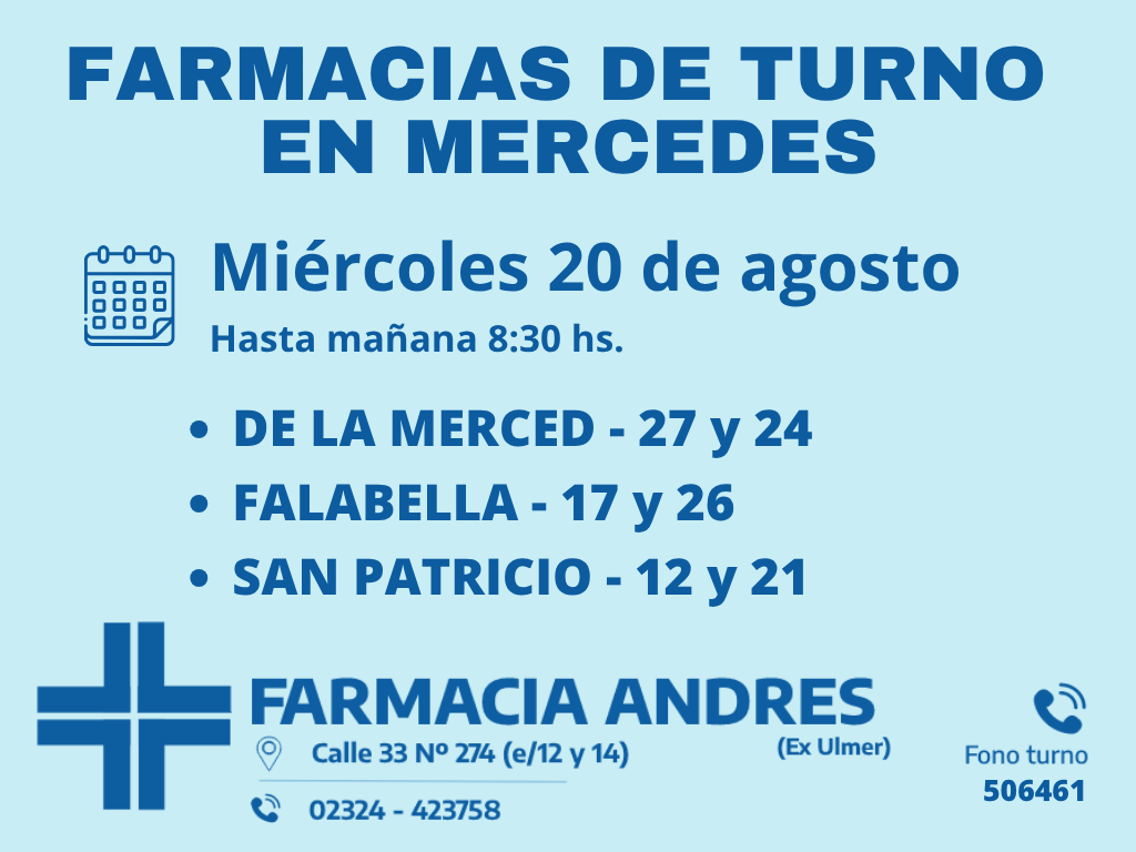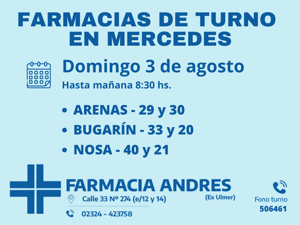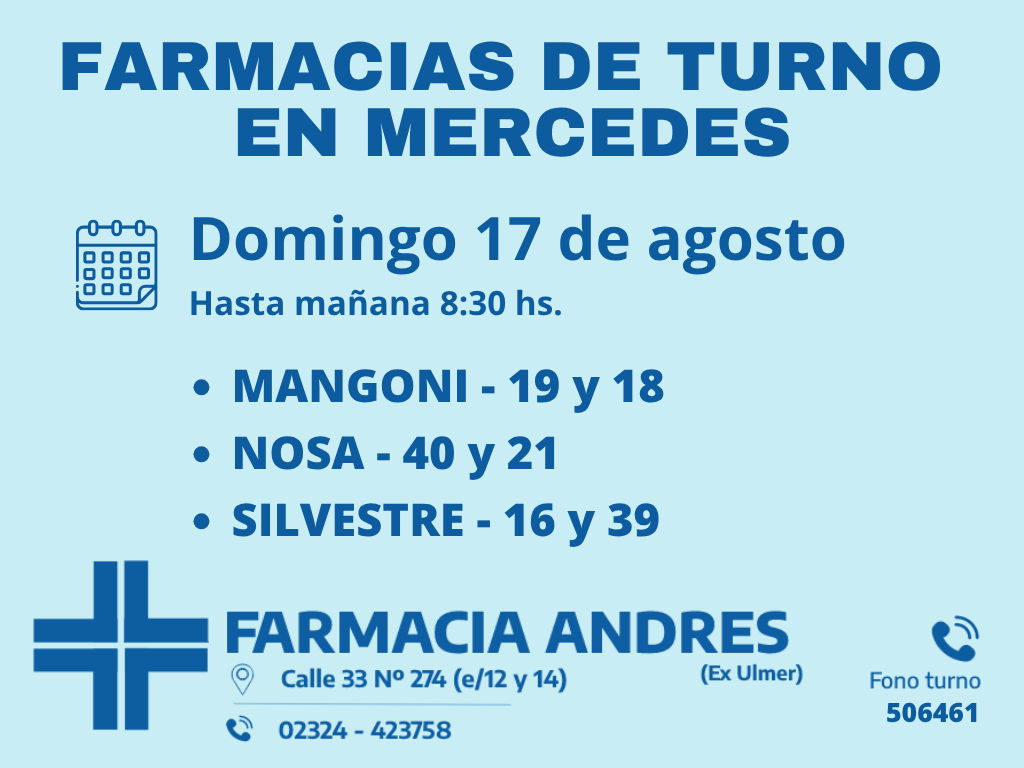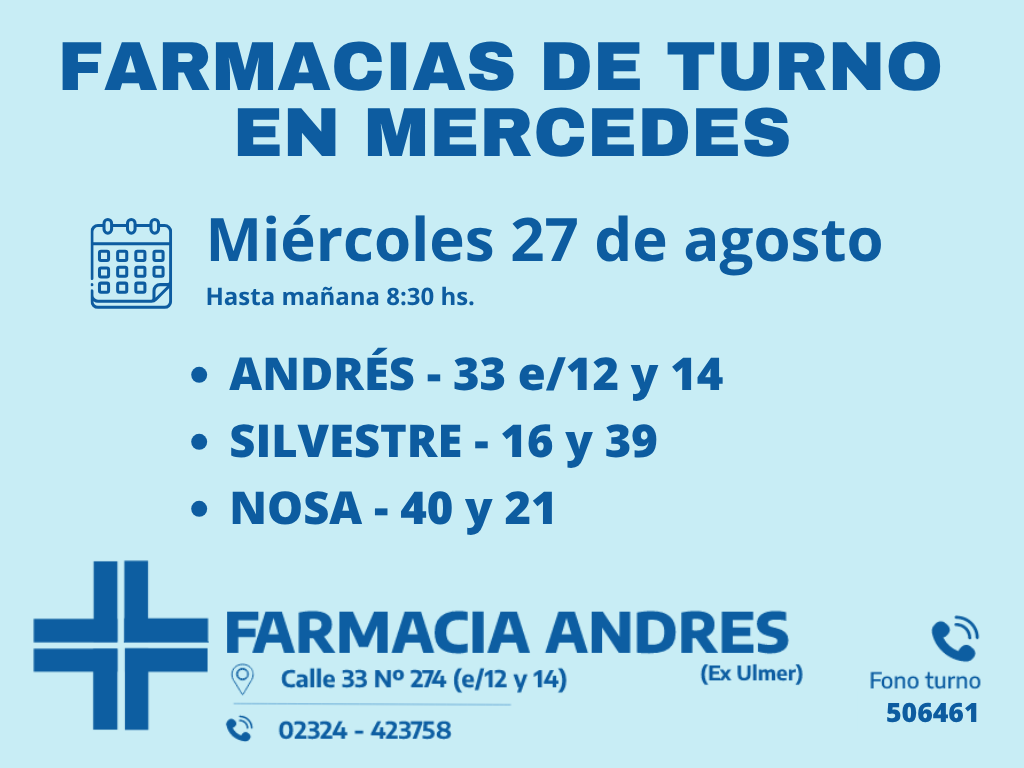 Desde las 8:30 del día de hoy hasta la misma hora de mañana, las farmacias de turno en Mercedes son: Andrés, Silvestre y Nosa.