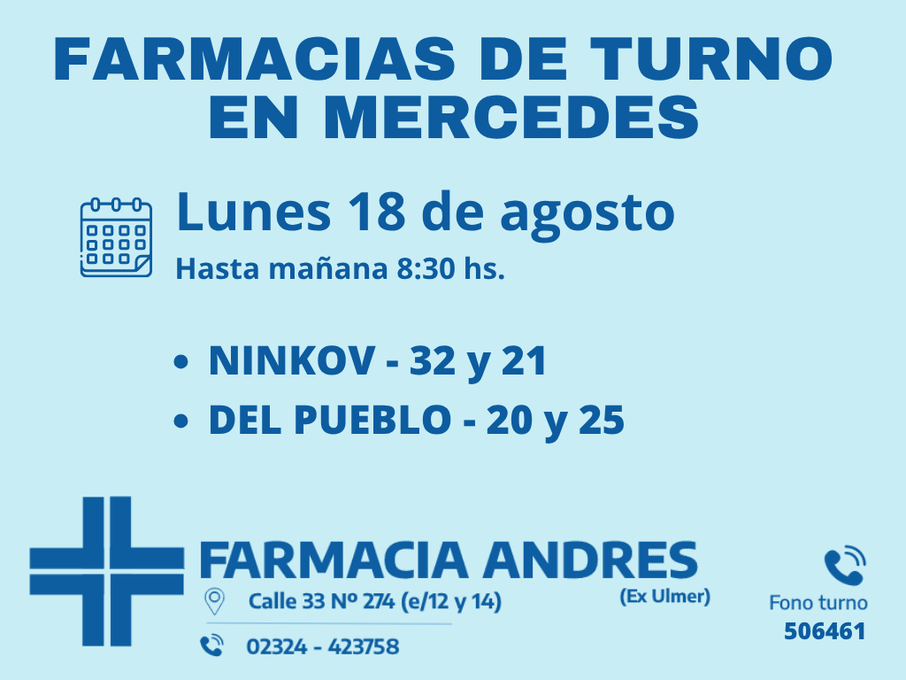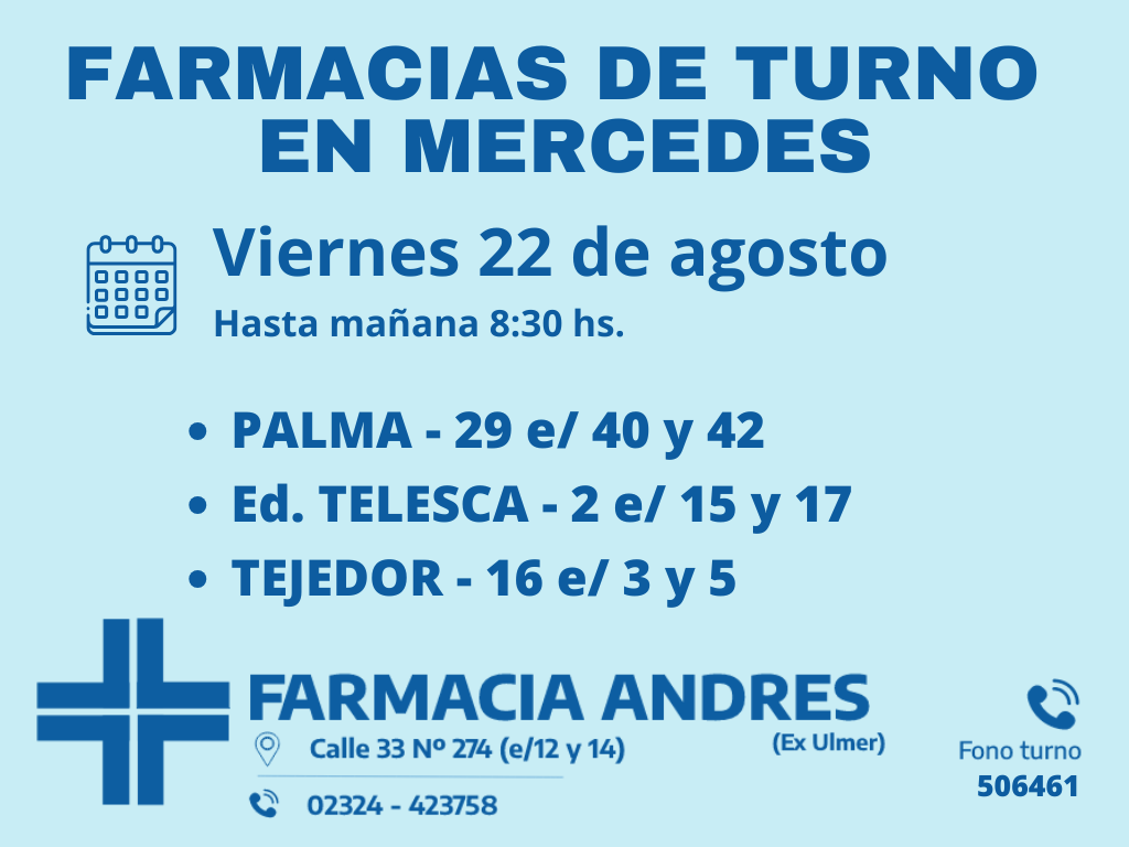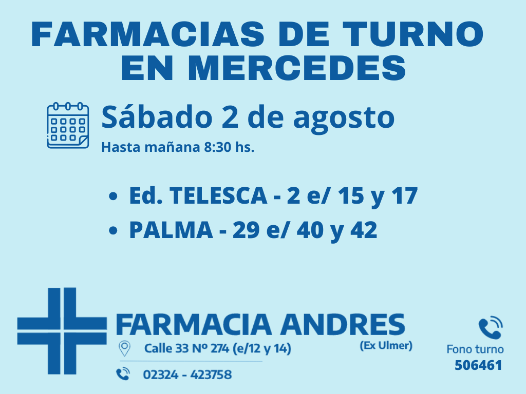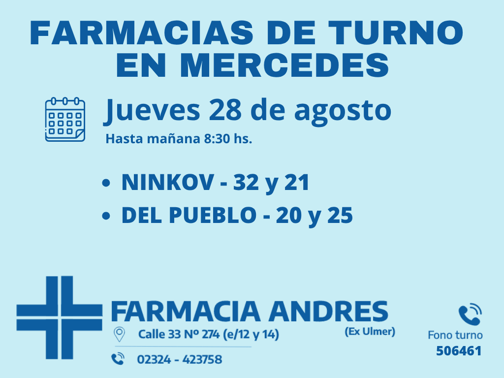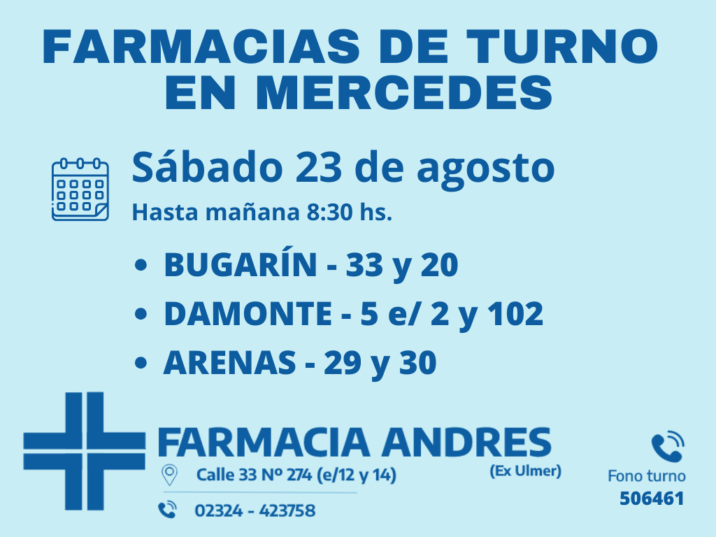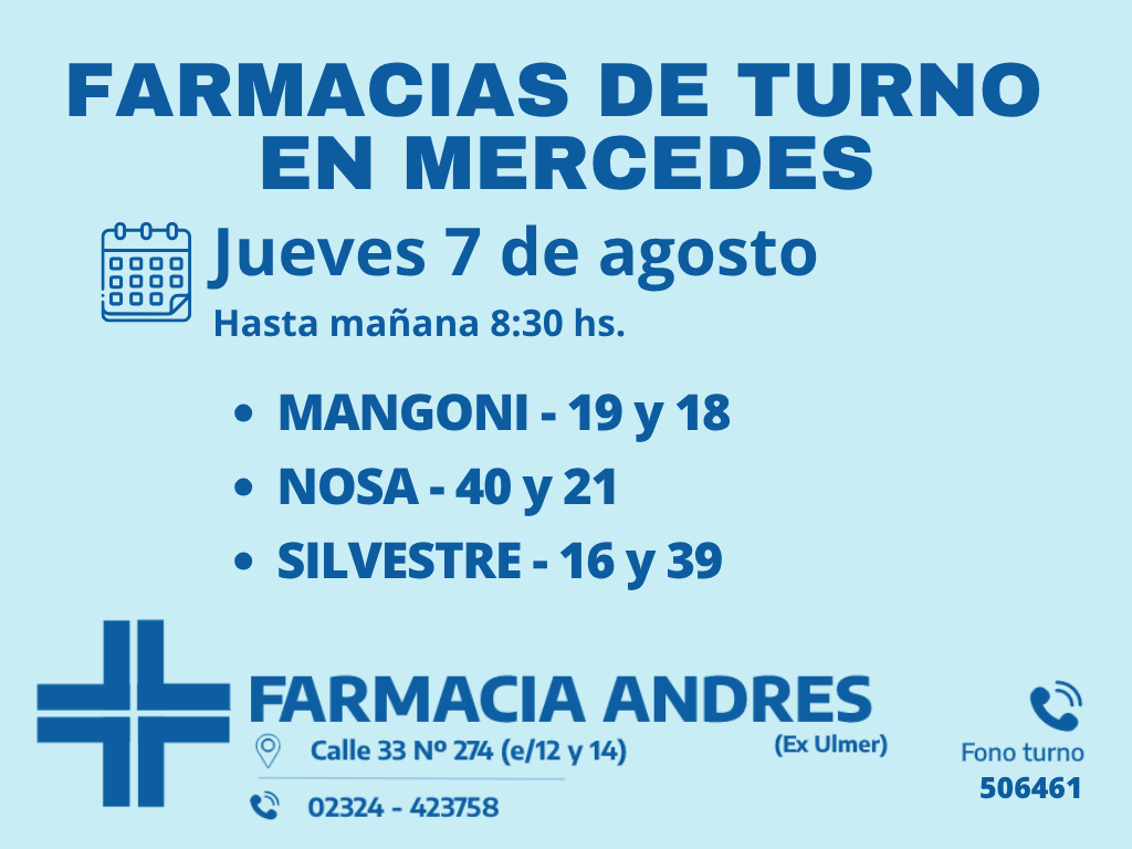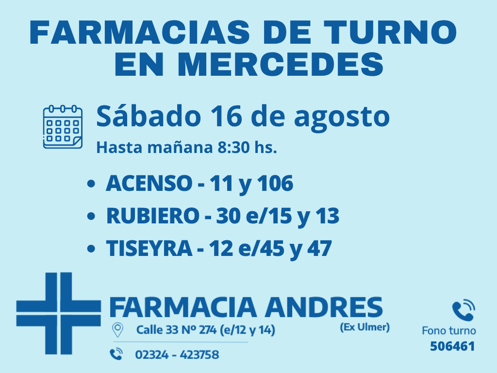 Desde las 8:30 del día de hoy hasta la misma hora de mañana, las farmacias de turno en Mercedes son: Andrés, Silvestre y Nosa.