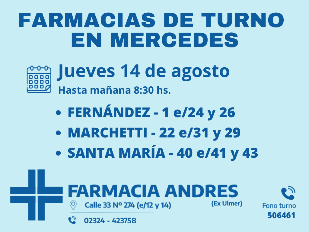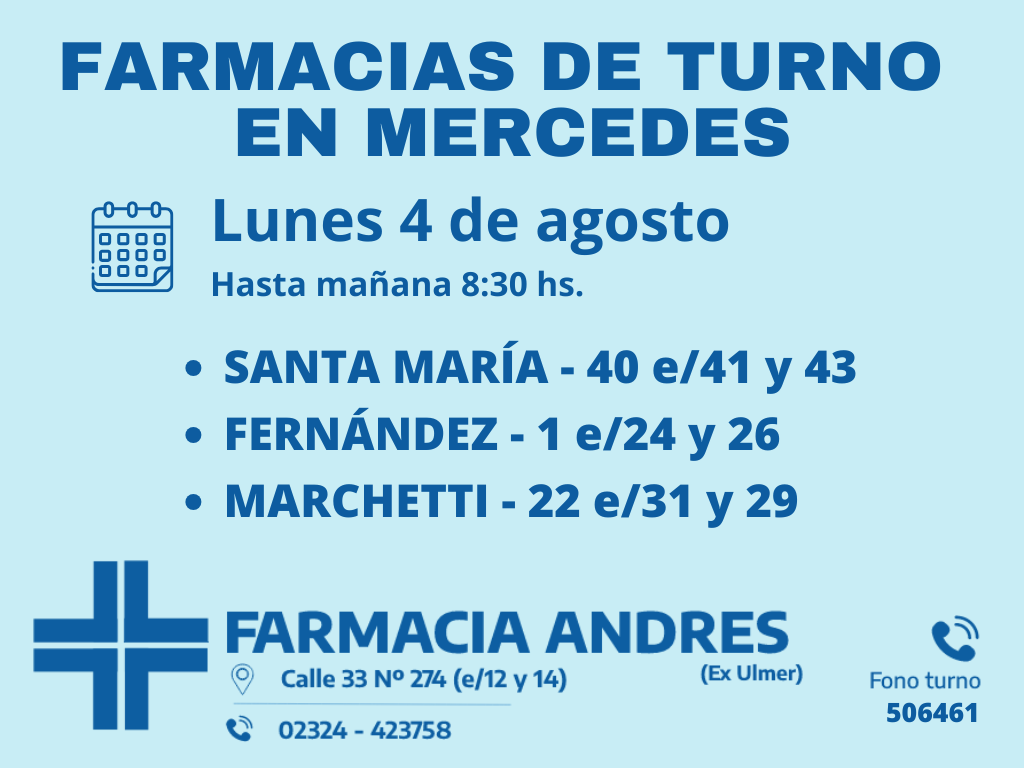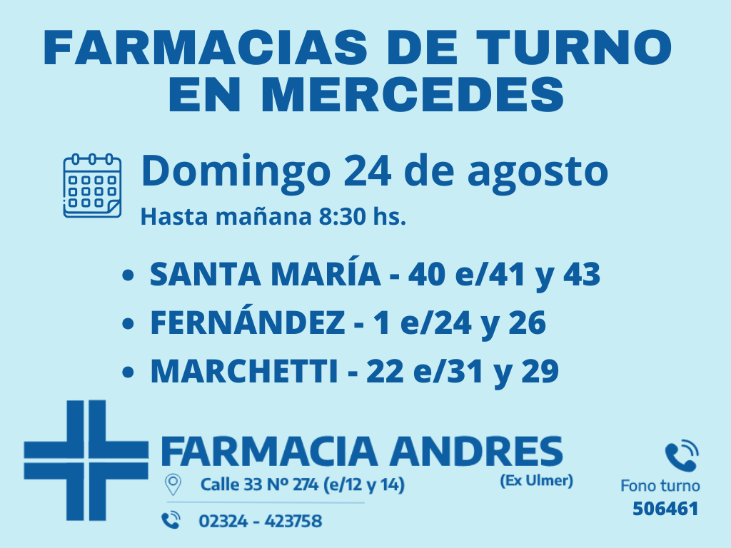 Desde las 8:30 del día de hoy hasta la misma hora de mañana, las farmacias de turno en Mercedes son: Santa María, Fernández y Marchetti.