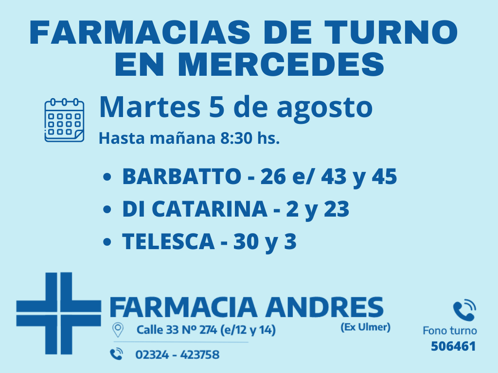 Desde las 8:30 del día de hoy hasta la misma hora de mañana, las farmacias de turno en Mercedes son: Barbatto, Di Catarina y Telesca.