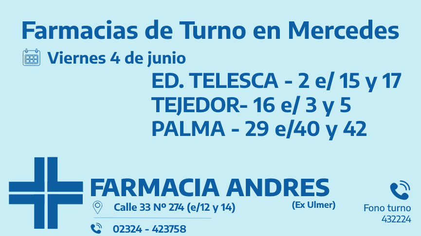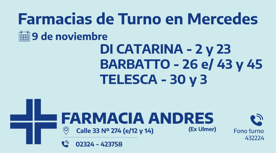 Desde las 8,30 del día de hoy hasta la misma hora de mañana, las farmacias de turno en Mercedes son Eduardo Telesca, Tejedor y Palma.